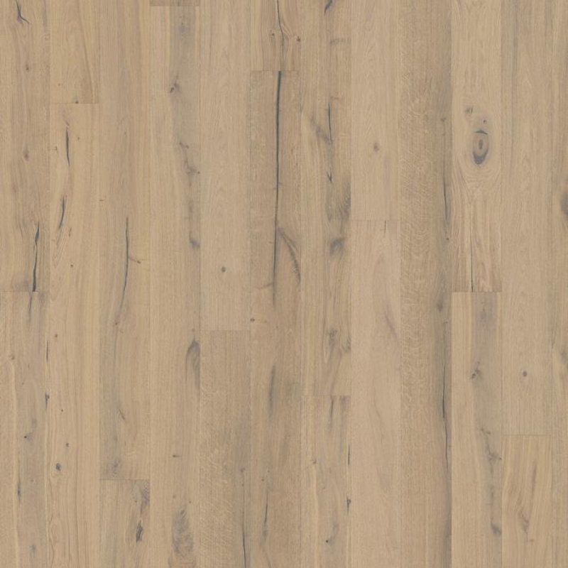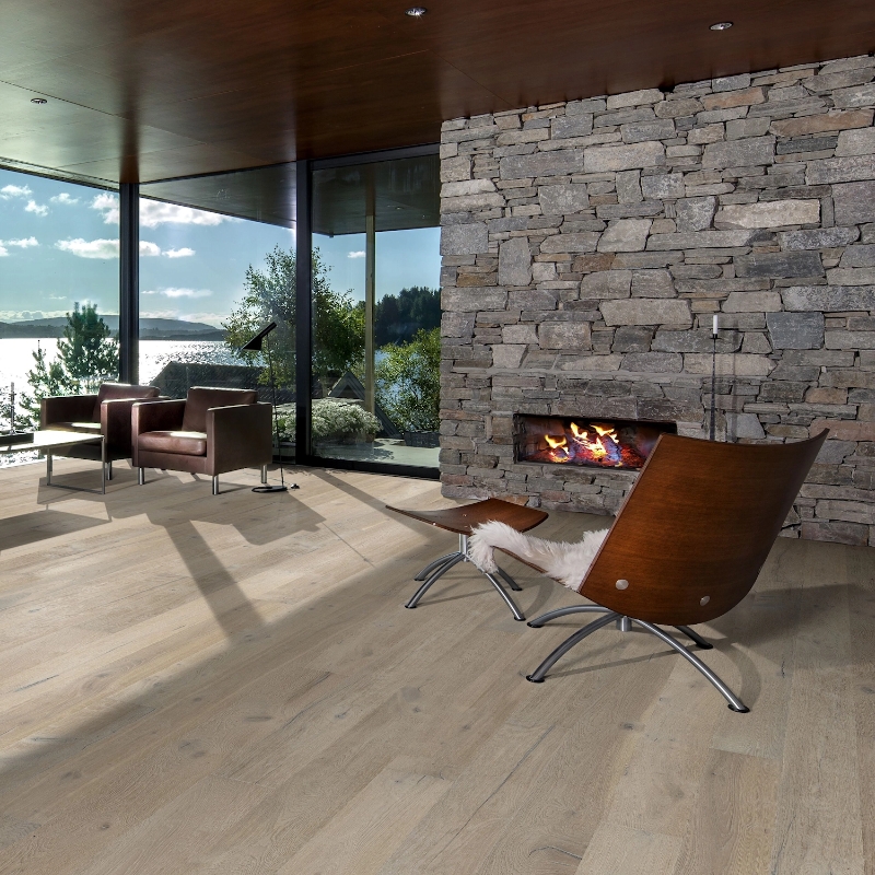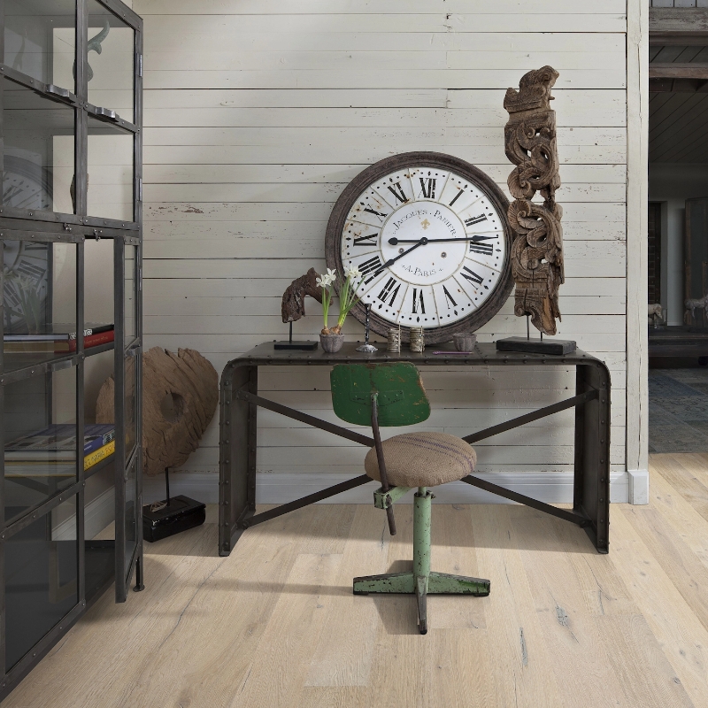 Muted white oak planks with natural knots and cracks create a serene, rustic look. Brushed and hand-scraped to enhance grain and texture, with four-sided bevels for a classic full plank finish.