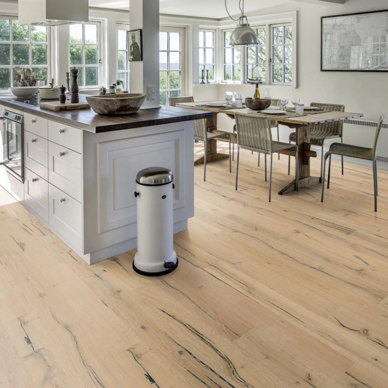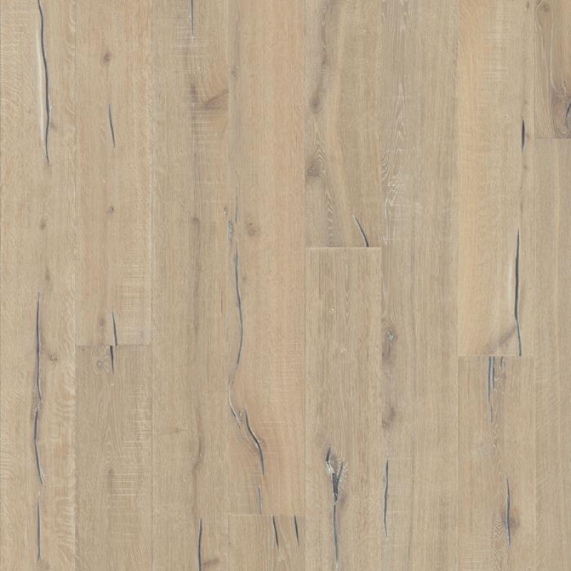 Flour-white stained oak floor with a rustic expression, balanced by a bisque finish. Light and dark contrasts are accented by occasional saw marks, with hand-brushing to enhance grain texture. Four-sided bevels ensure a classic full plank look.