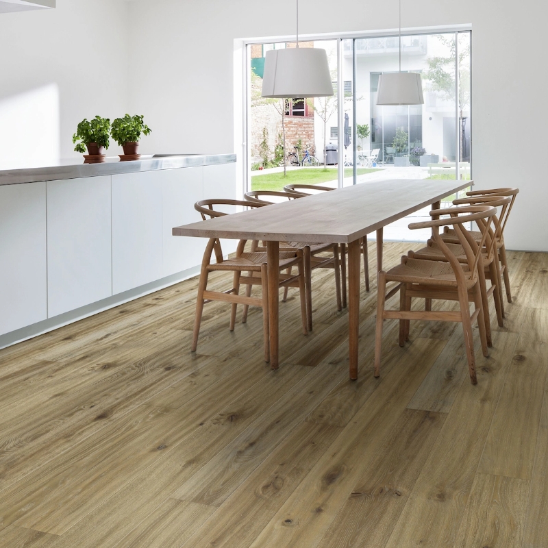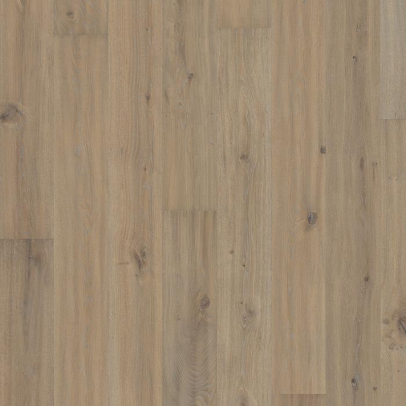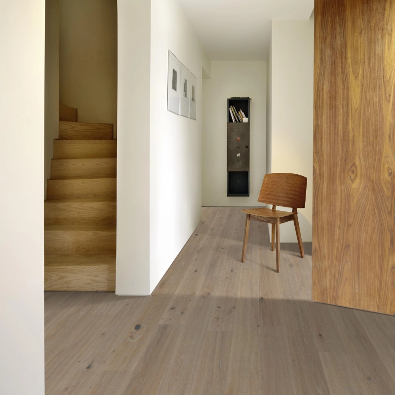 Grey stained oak floor with warm nuances for a calm, balanced expression. Brushed to enhance grain texture, with hand-scraping for a rustic look. Four-sided bevels ensure a classic full plank appearance.