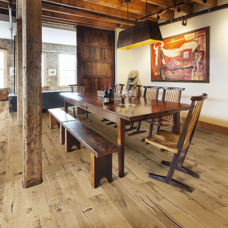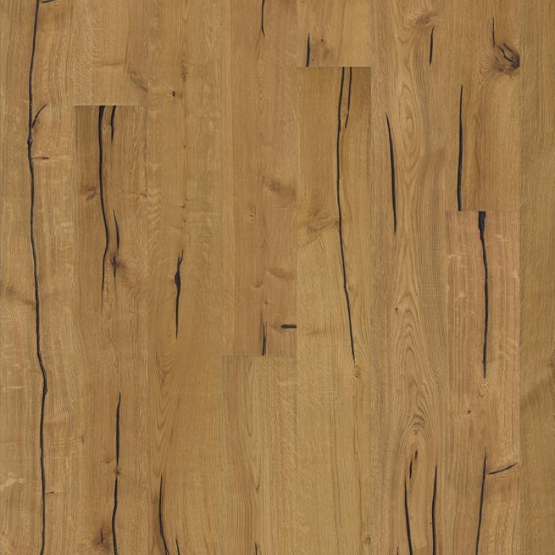 Amber stained oak floor with honey hues and a rustic expression, enhanced by light and dark contrasts and occasional saw marks. Hand-scraped for a restored look, with four-sided bevels for a classic full plank appearance.