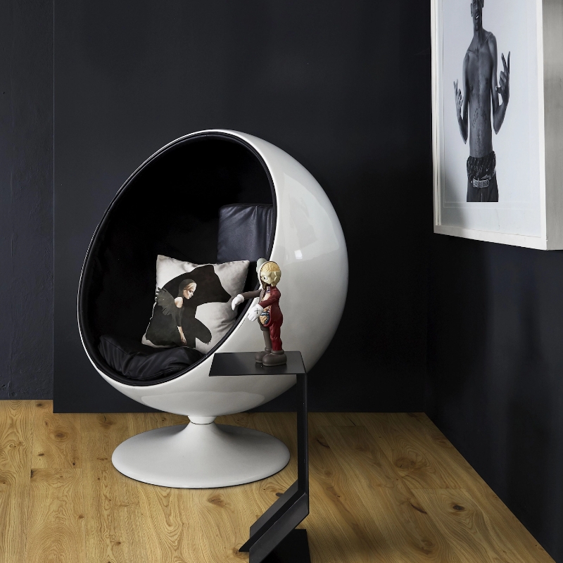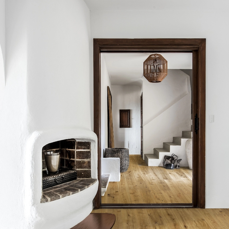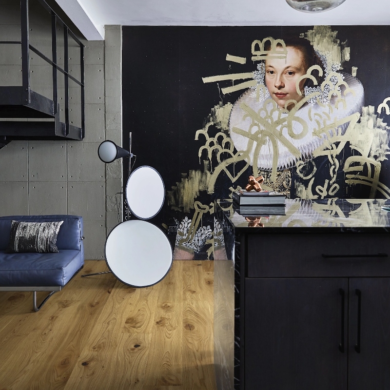 Golden stained oak floor with late autumn harvest tones for a lively, naturally balanced contrast. Brushed to enhance grain texture, with hand-scraping for a worn look. Four-sided bevels ensure a classic full plank appearance.