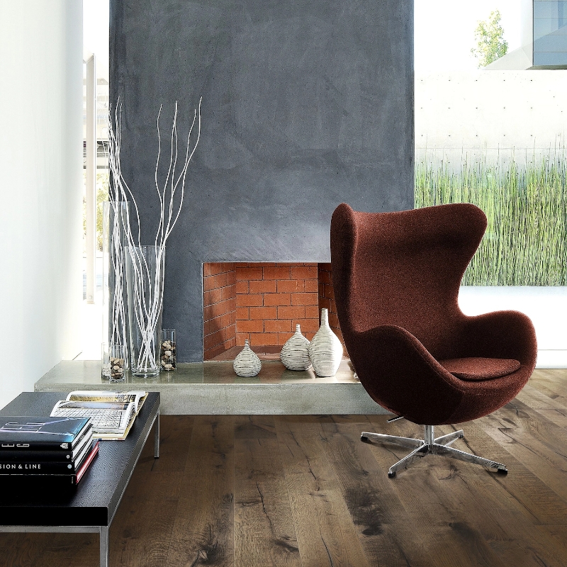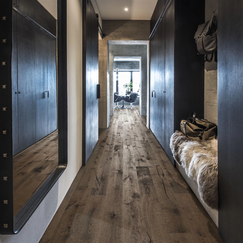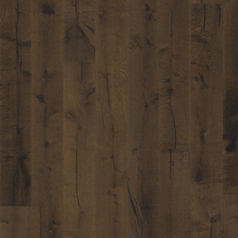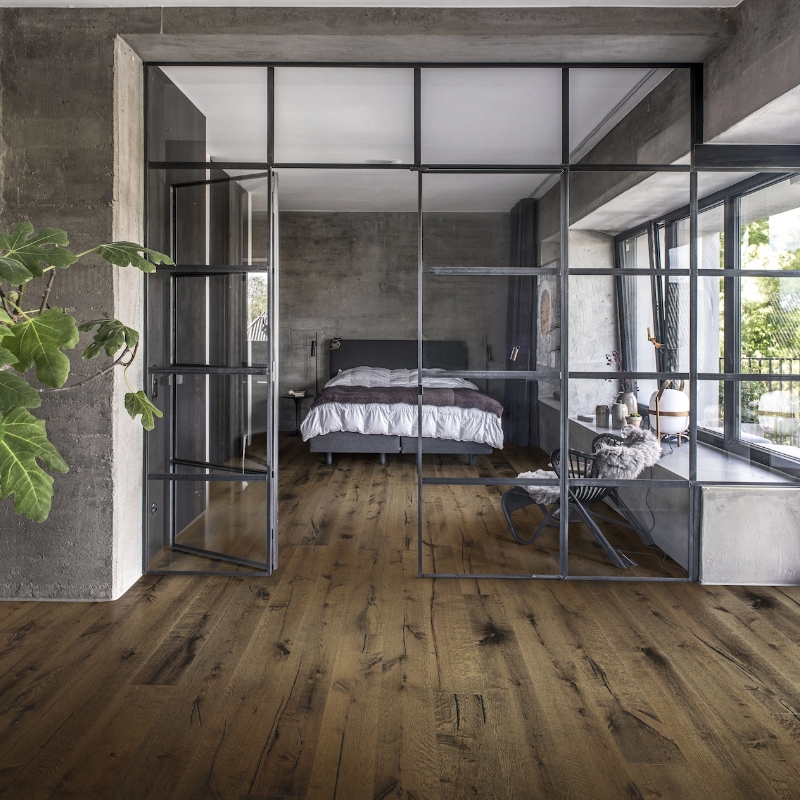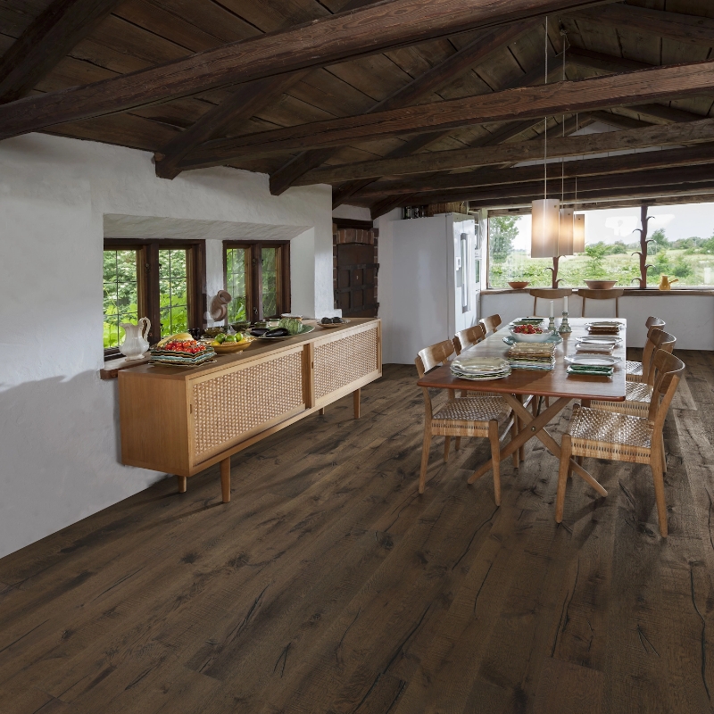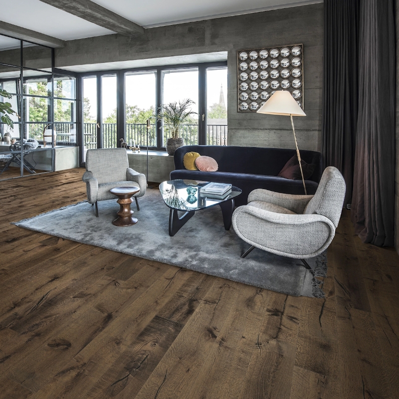 Coffee stained oak floor with fully smoked, charcoal nuances for a rustic expression. Light and dark contrasts are highlighted by occasional saw marks, with hand-scraping enhancing the worn look. Four-sided bevels ensure a classic full plank appearance.