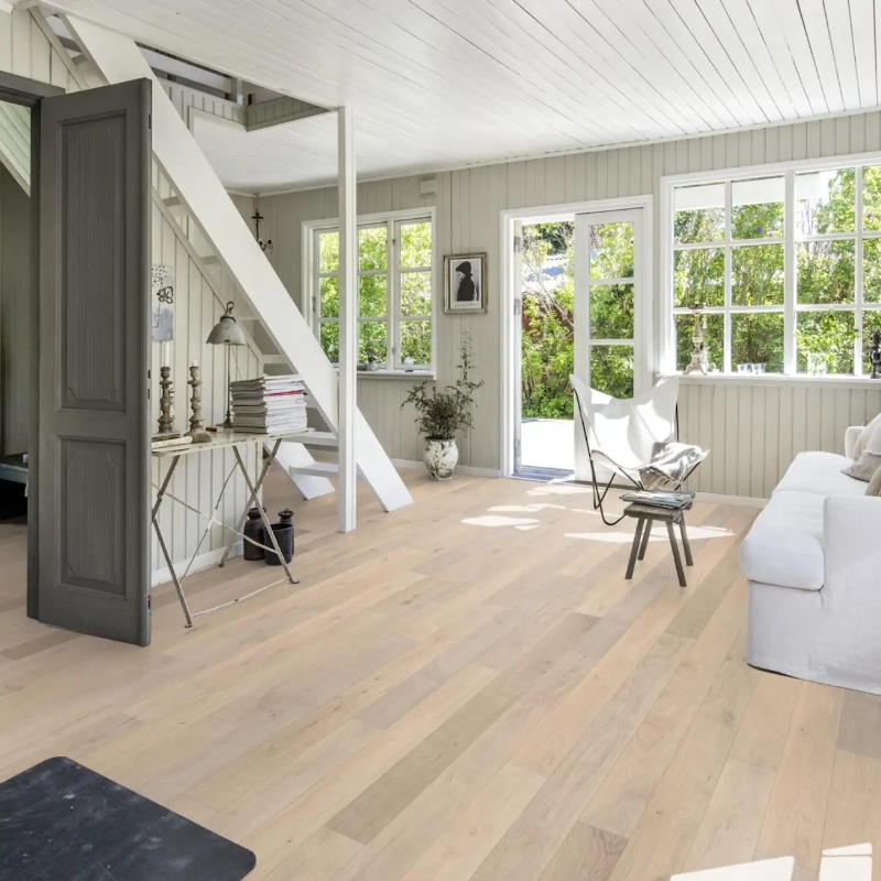 Oak Cadence features a 1-strip design and matt finish. Appearance is rustic, with knots and color variations from light to dark.