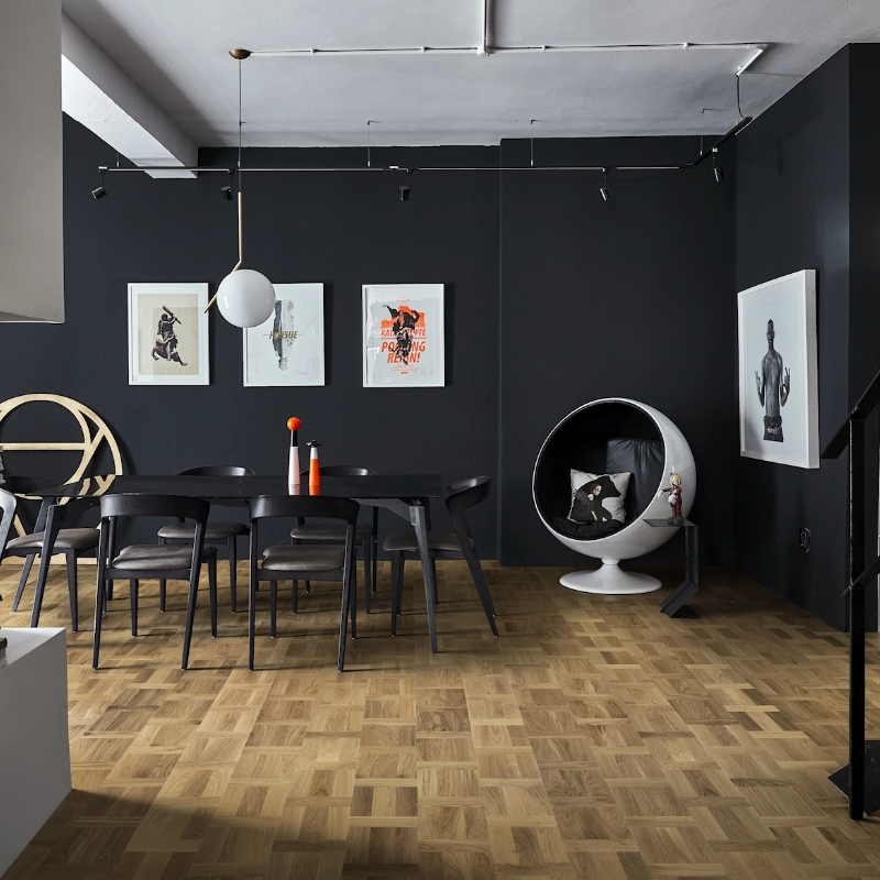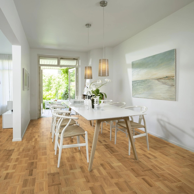 Warm honey-toned oak floor in a classic Dutch pattern. Silk lacquer adds a polished look while highlighting the wood’s natural character and protecting against daily wear without extra shine.