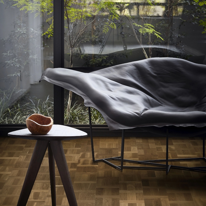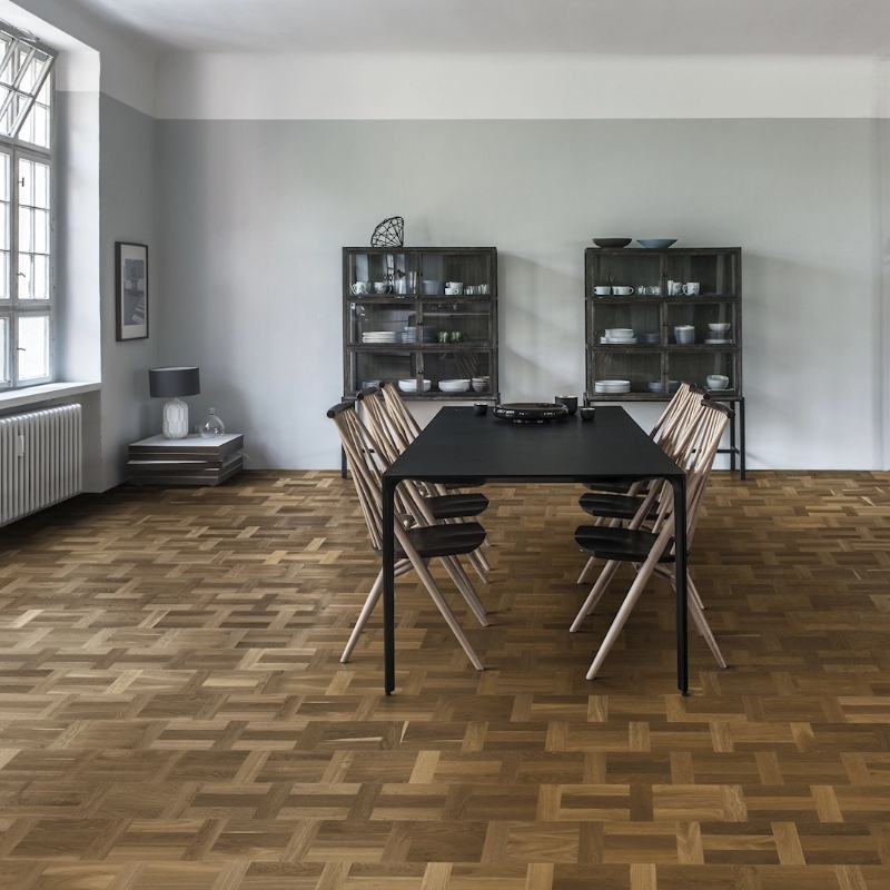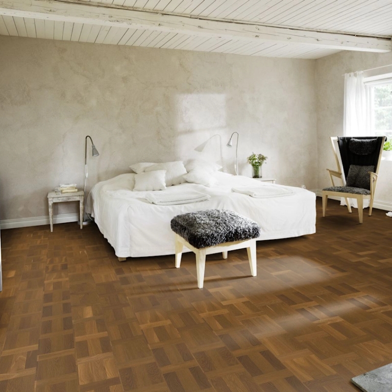 Lightly smoked coffee brown oak floor in a classic Dutch pattern, offering timeless elegance. Finished with matt lacquer for soft sheen and durable, glare-free protection.