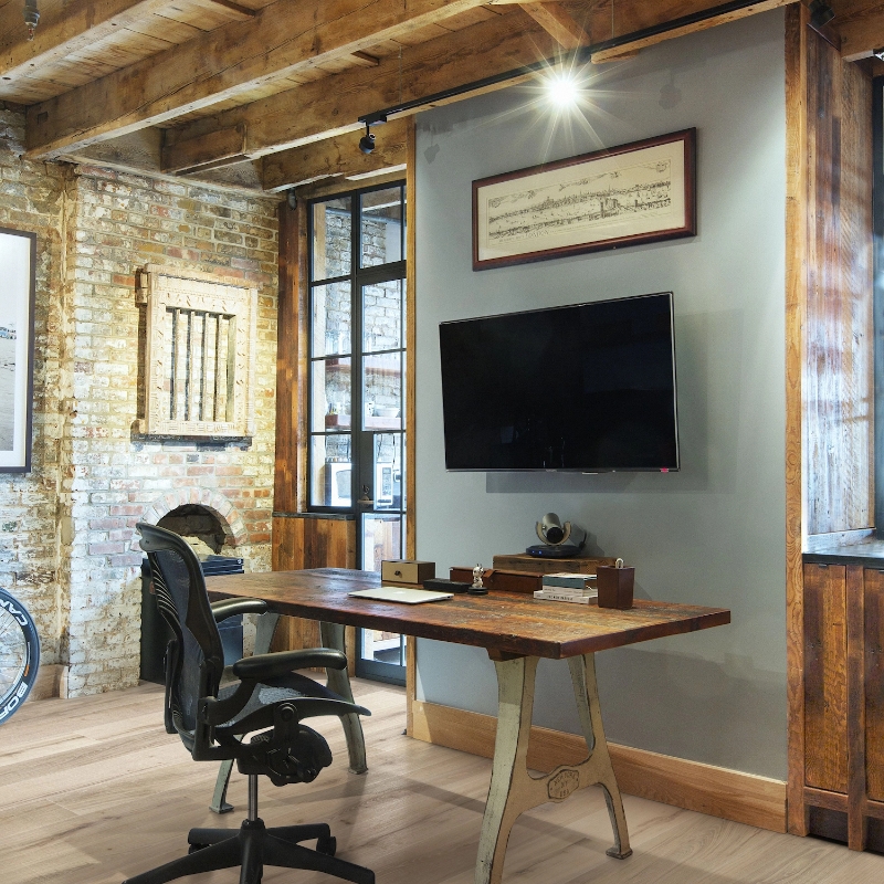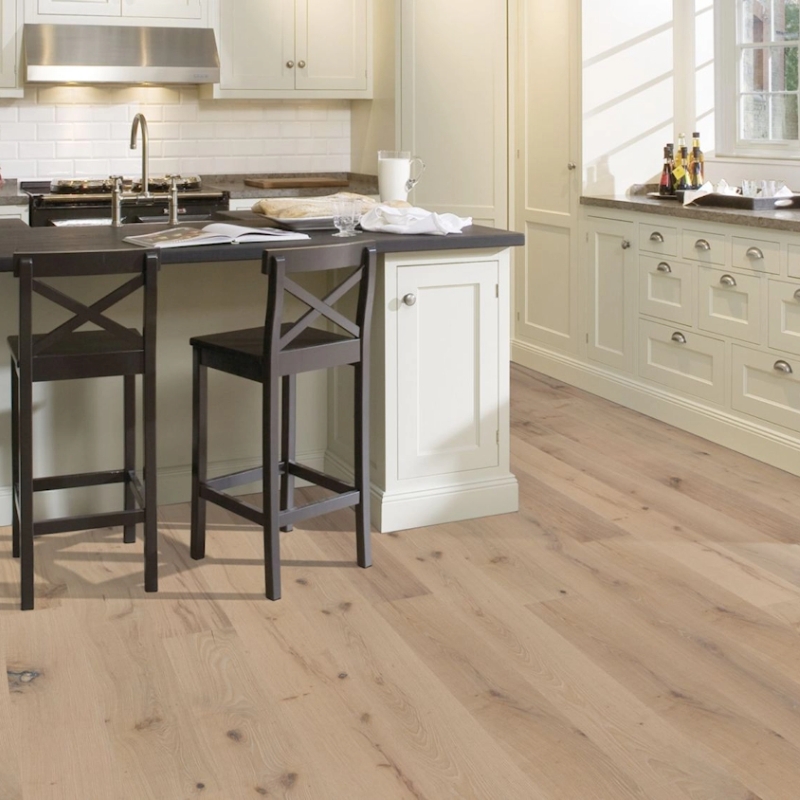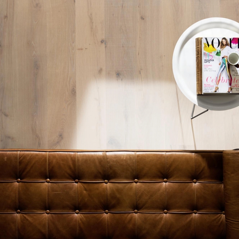 Plank oak floor in dusky blonde with warm grey tones for a rustic look. Heavily brushed with genuine cracks, knots, and saw marks to enhance grain texture. Four-sided bevels ensure a classic full plank appearance.