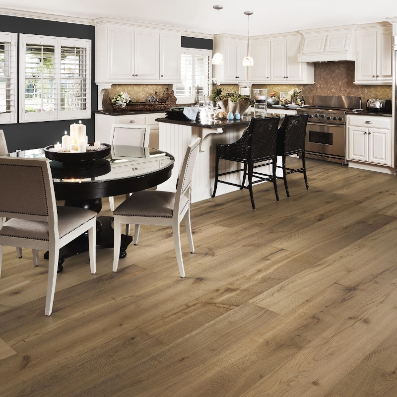 Smoked stone-stained oak planks with cool undertones and a balanced look. Heavy brushing, cracks, knots, and saw marks enhance the grain’s rustic texture. Four-sided beveling adds a classic, full plank appearance.