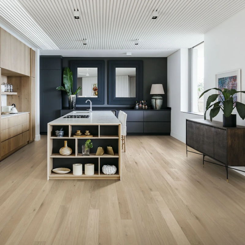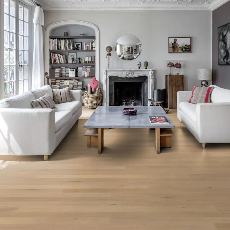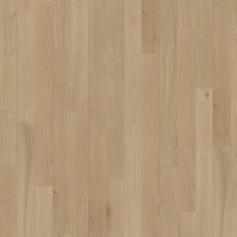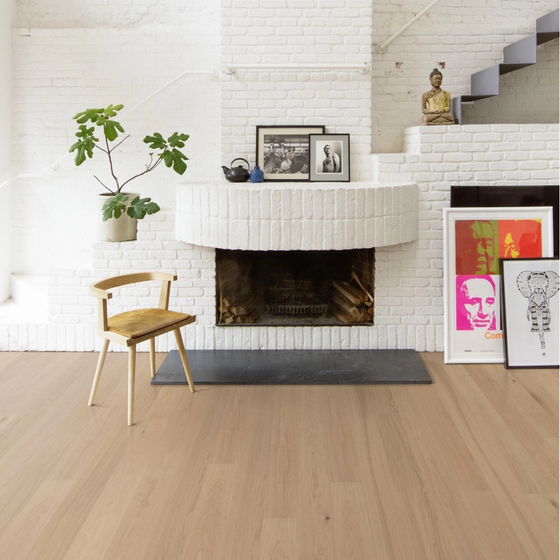Plank oak floor with a warm white-pigmented matt lacquer for a neutral, freshly cut wood appearance. Brushed to enhance grain texture, with four-sided micro-bevels for a classic finish and glare-free protection.