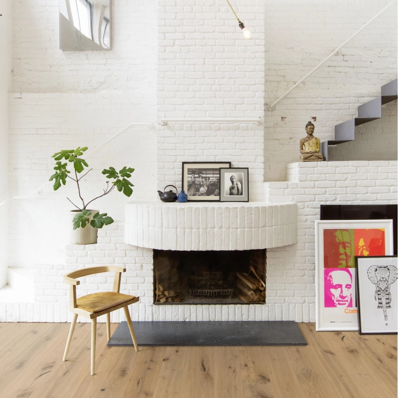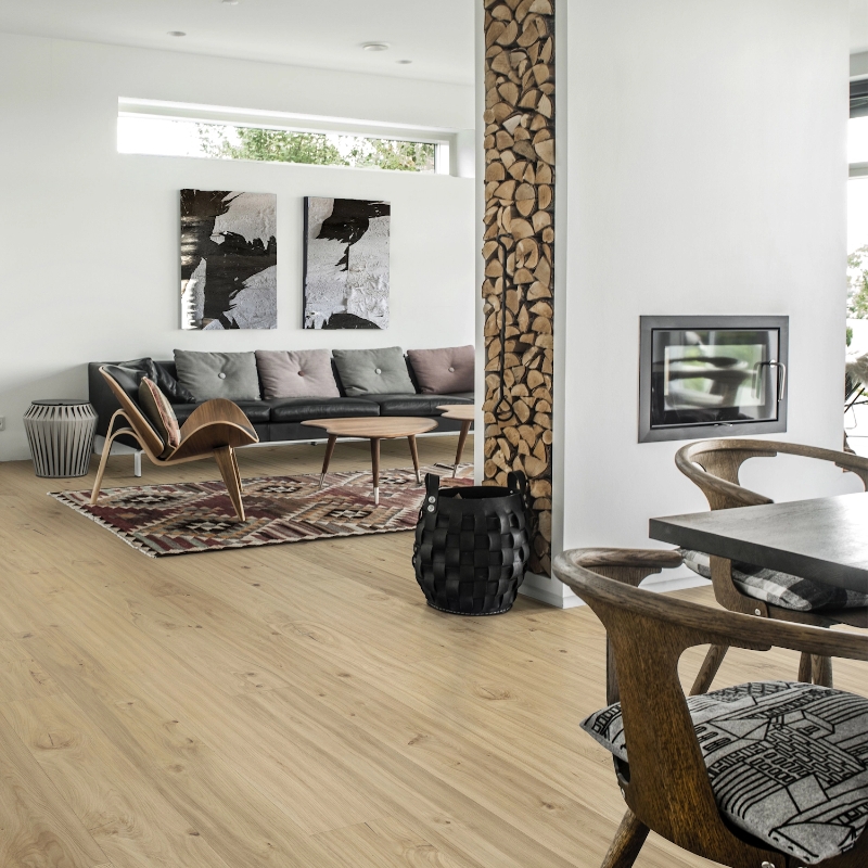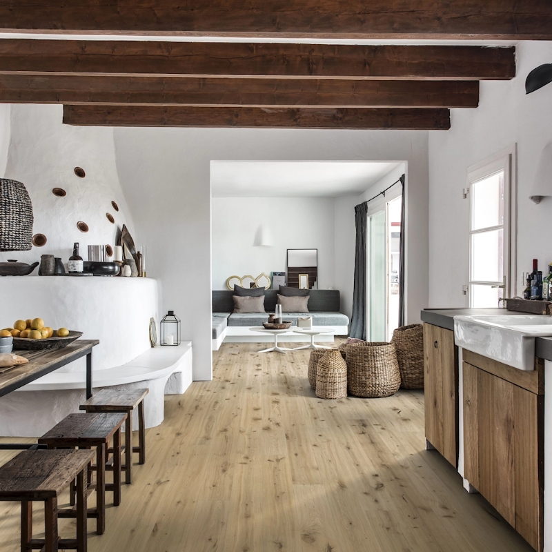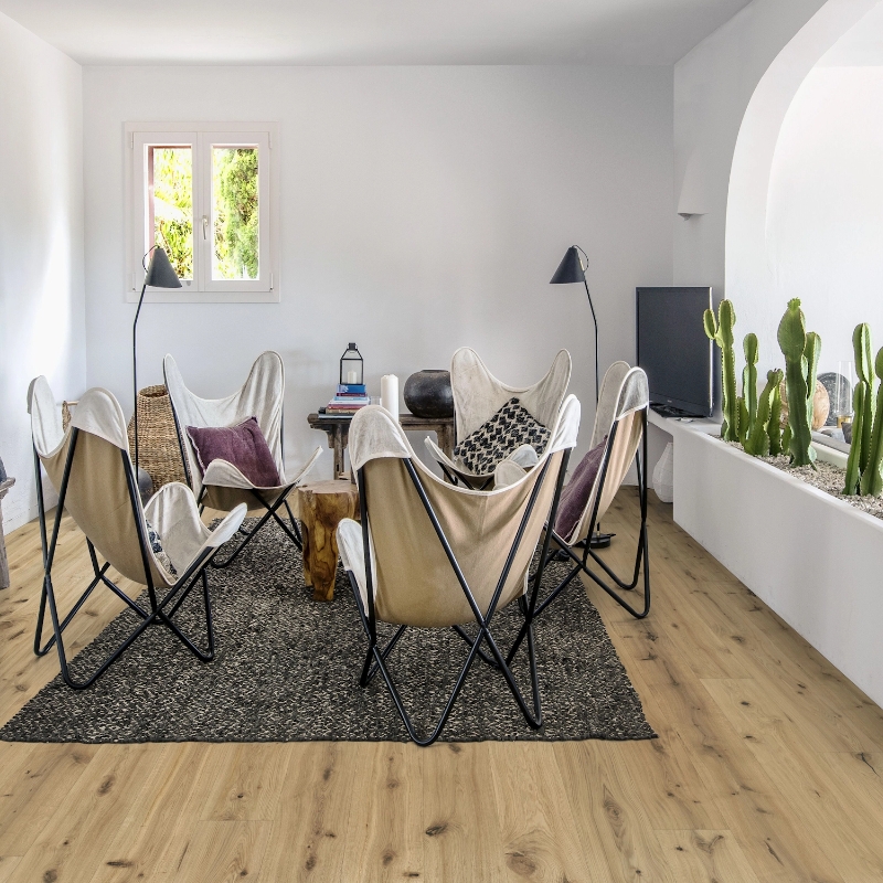Plank oak floor with a transparent white stain for a pale, natural look. Hand-scraped and brushed to highlight knots and grain texture, with four-sided bevels for a classic, rustic expression.