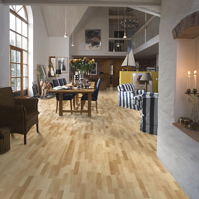3-strip North American maple floor in golden straw tones for a subtle, harmonious look. Silk lacquer adds a polished finish that highlights the wood’s natural character while protecting against daily wear.