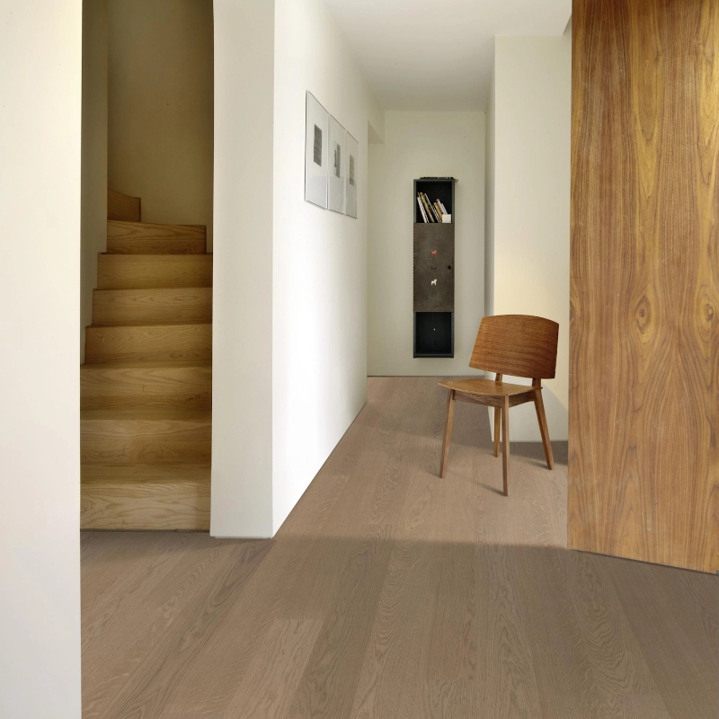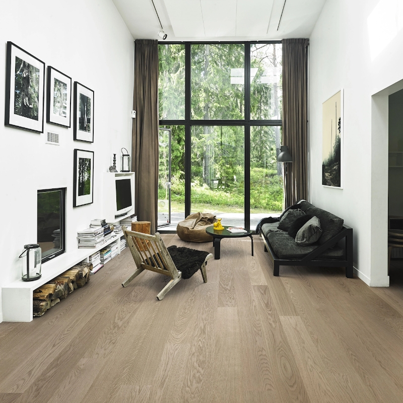 Grey-toned oak planks with even color variation and a brushed finish that enhances natural grain and texture. Ultra-matt lacquer adds a freshly sawn look and daily protection, while micro-bevelled edges create a classic full plank feel.