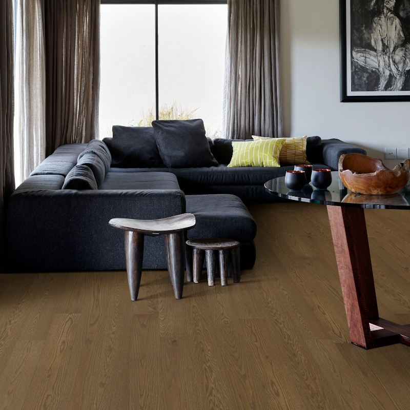 Warm brown oak planks with caramel undertones highlight the rustic grain for a timeless, welcoming ambiance. A perfect blend of natural beauty and elegant charm.