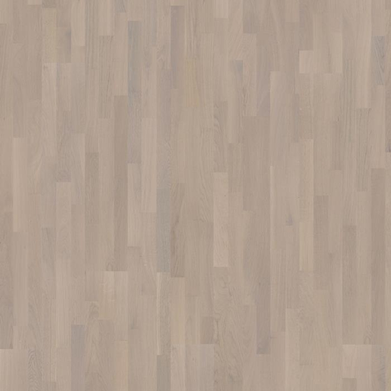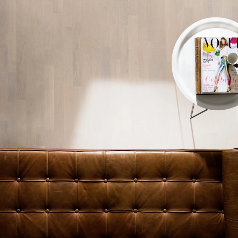 3-strip oak floor with a gentle white color, evoking Mediterranean chalked stone walls. Matt lacquered for a modern, classic, and timeless appearance.