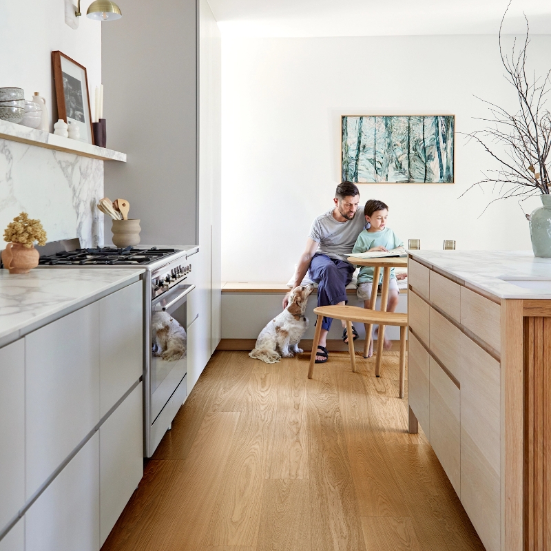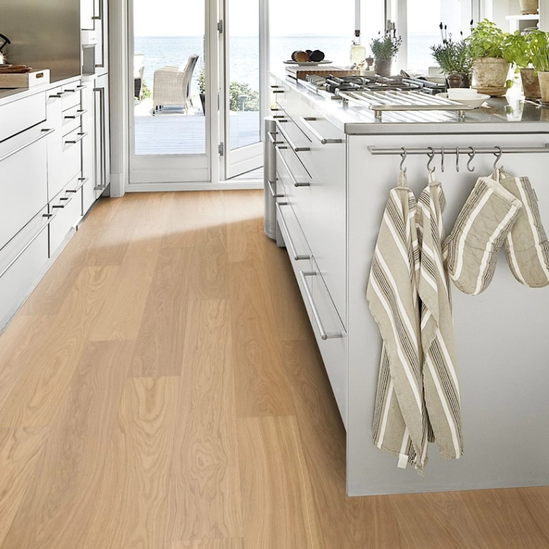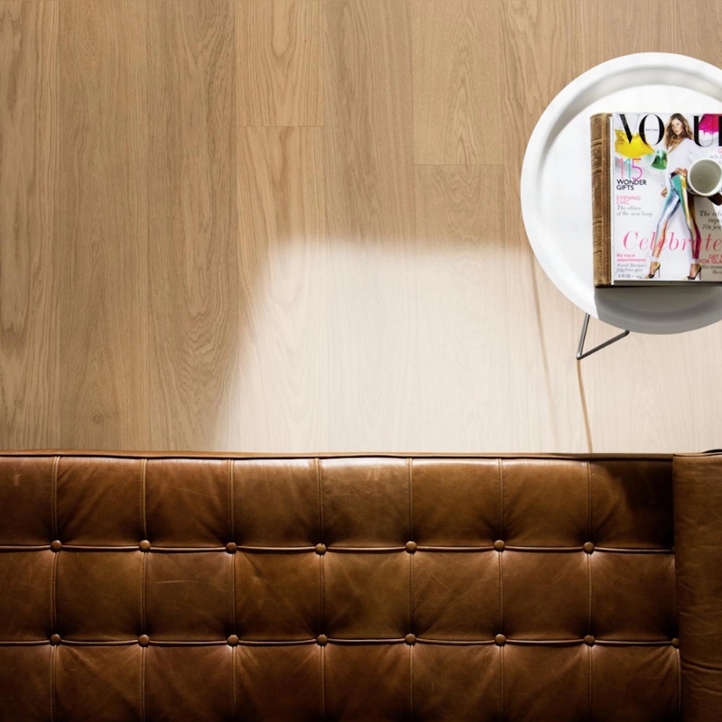 Natural oak floor with warm grain and unstained character. Timeless, rustic look with authentic wood texture.