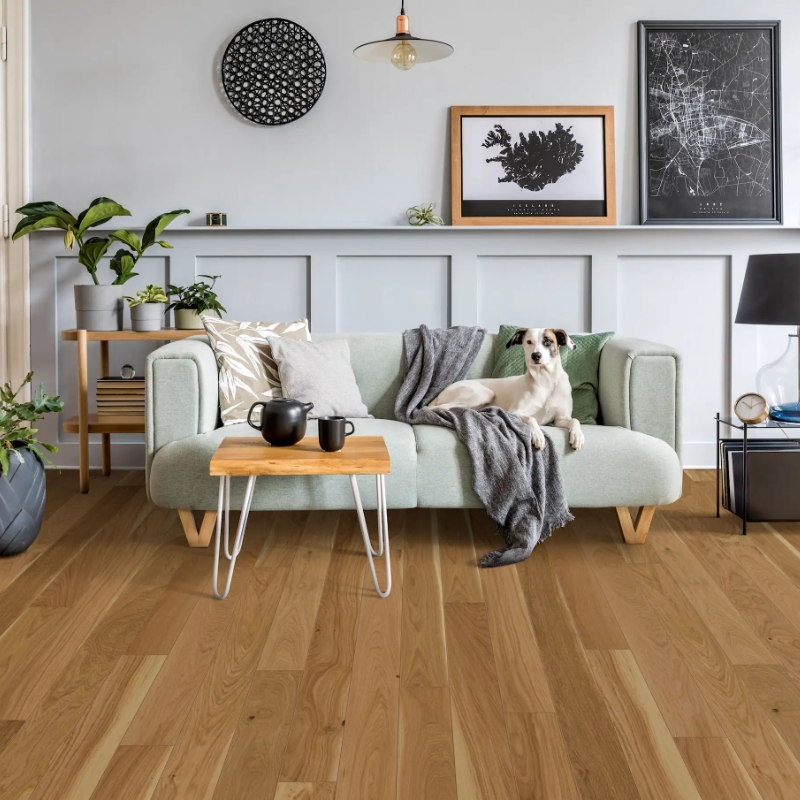 Warm neutral oak finish with soft hue and smooth matte texture. Creates calming backdrop with understated sophistication and warmth.