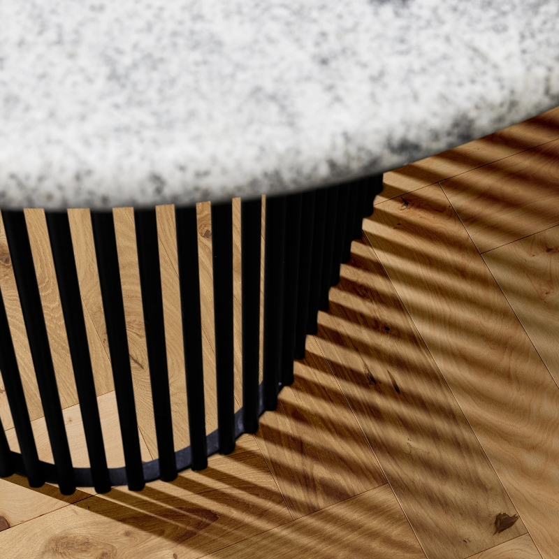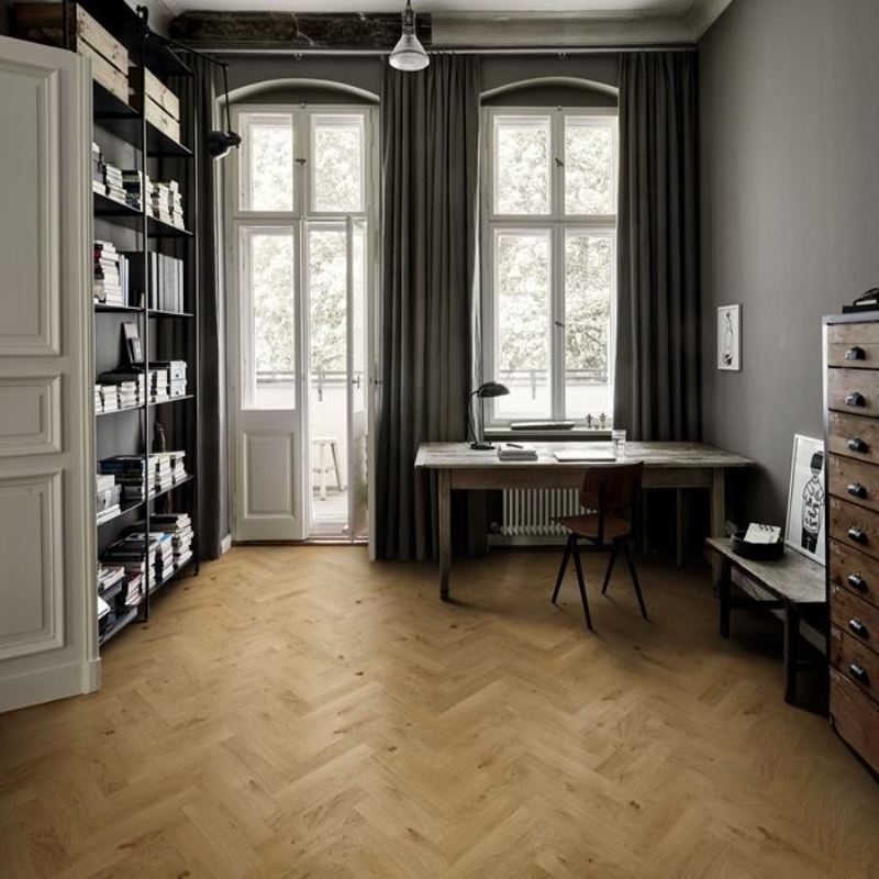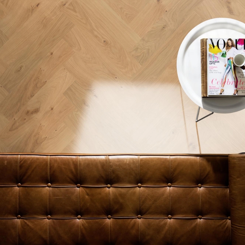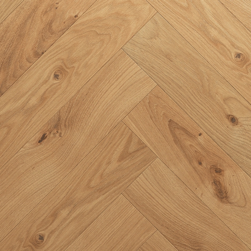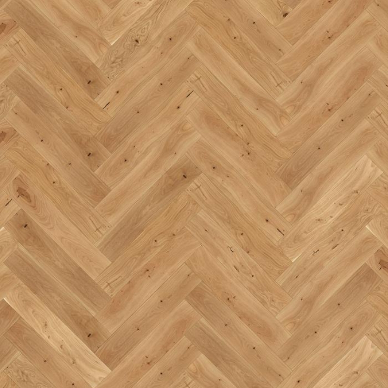 Premium 2-layer European oak herringbone with color variations and knots. Features micro-bevelled edges and brushed, matt lacquered finish enhancing natural grain. Includes left and right elements for glue-down installation.