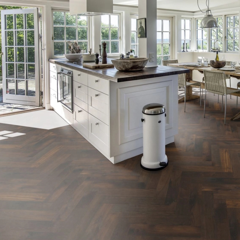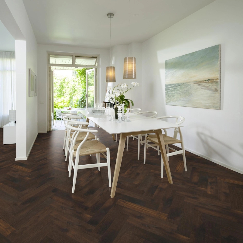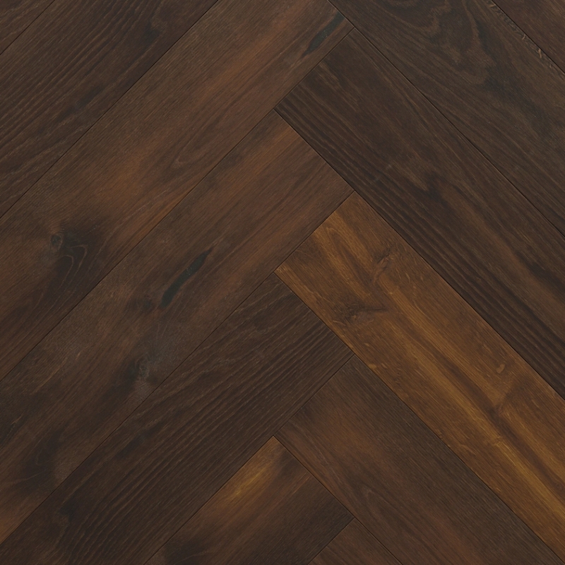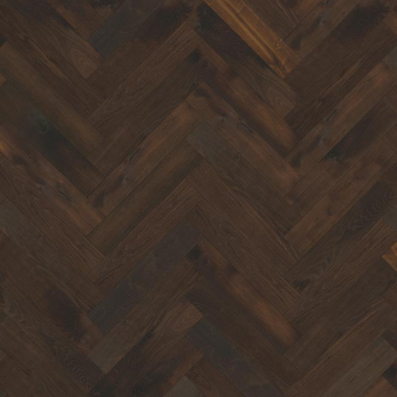 Premium 2-layer deep-smoked European oak herringbone with color variations and knots. Features micro-bevelled edges and brushed, oiled finish enhancing natural grain. Includes left and right elements for glue-down installation.