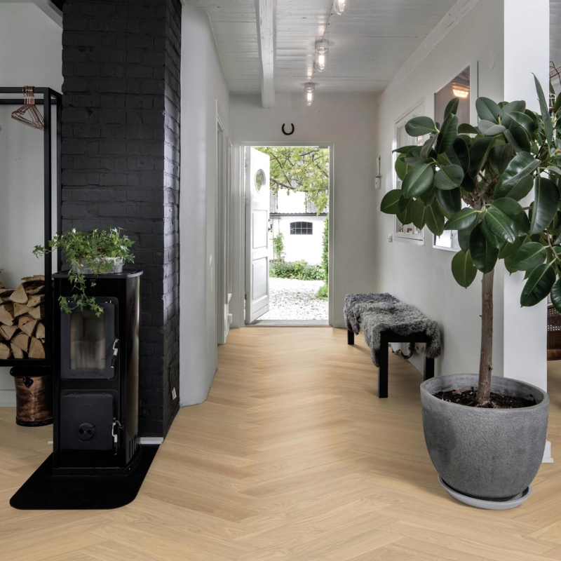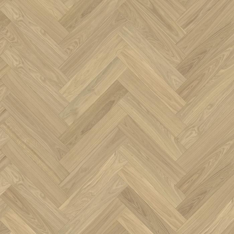Premium oak herringbone with moderate color variations and few knots. 2-layer parquet with four-sided micro-beveling. Brushed and dim white oiled finish enhances natural wood grain and texture.