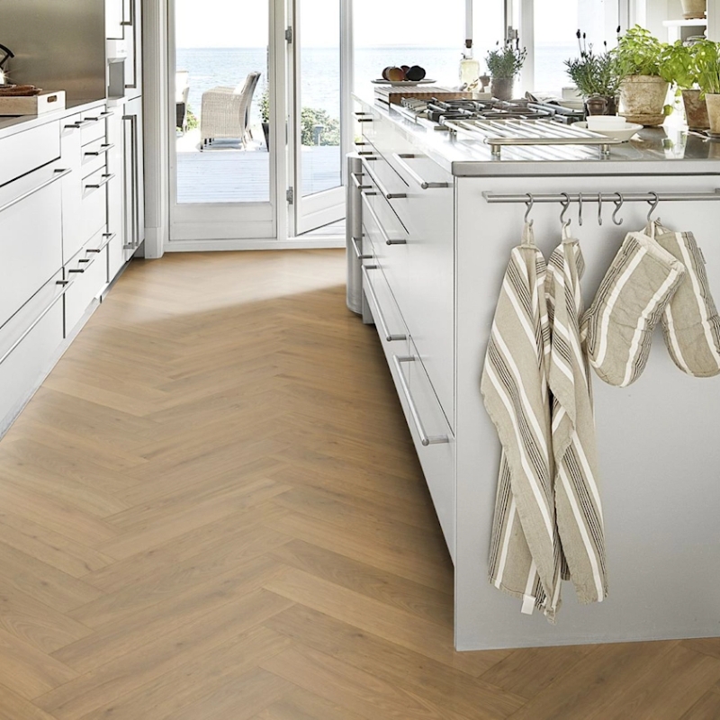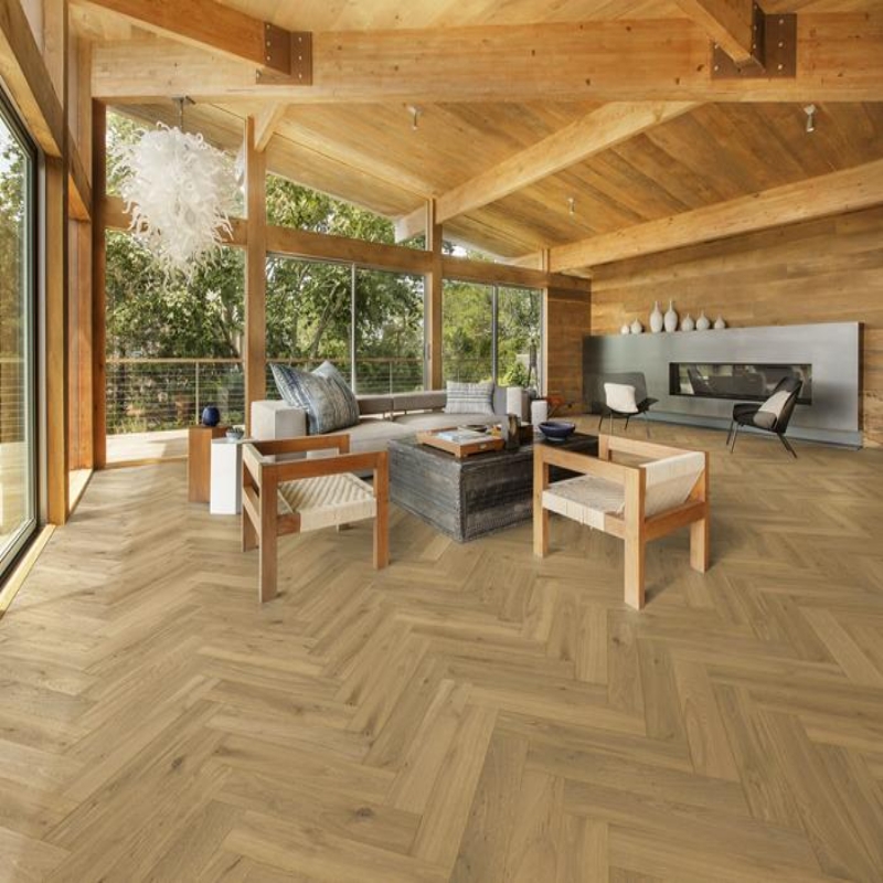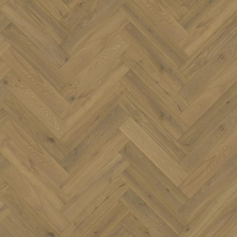 Premium European oak herringbone with natural color variations and knots. Lightly smoked surface with brushed texture and tinted grey oil finish for subtle, patinated look. Four-sided micro-beveling accentuates generous dimensions.