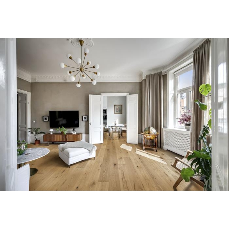 In Oak Aster the natural oak is left to shine in all its own glory with no staining, allowing the warm colour of the oak to penetrate the oiled surface uninhibited. Each board is carefully brushed, accentuating the natural wood grain while softening the texture, knots and cracks. Any contrast in colour are purely natural, letting the raw material speak for itself. Oak Aster is also available in a matt lacquered version.
