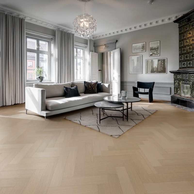Light greige tones and a soft brushed surface give this herringbone floor a refined, natural texture. The ultra matt finish adds a calm, contemporary feel with understated elegance.