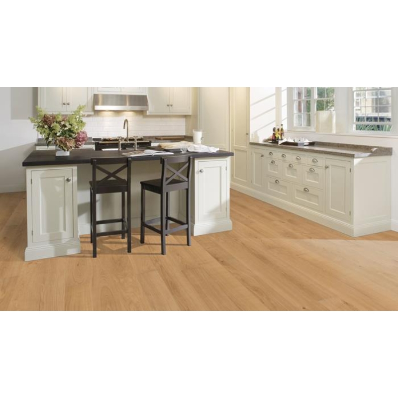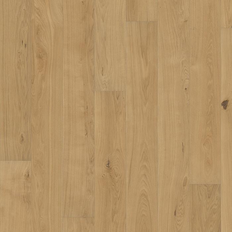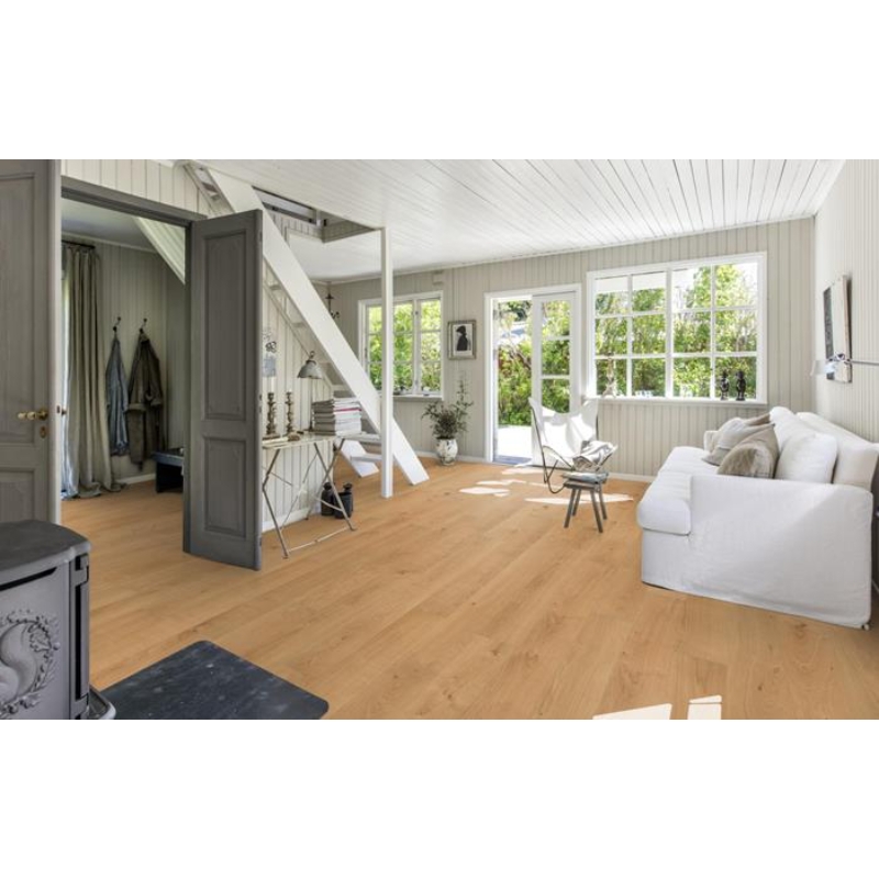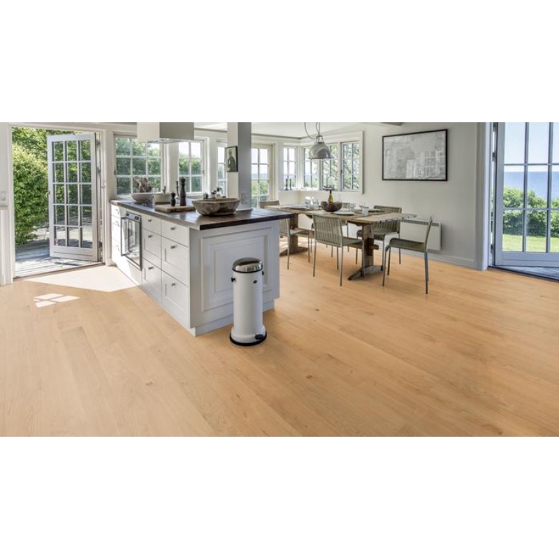 Oak Piazza CD Matt is a premium 2-layer parquet flooring crafted from European oak, featuring knots and moderate color variations. The plank format is highlighted by four-sided micro-bevelling, while the brushed and matt lacquered finish enhances the wood’s natural grain and texture. Kährs Piazza and Large Herringbone products can be installed together making it possible to use Piazza as frame board for herringbone pattern.