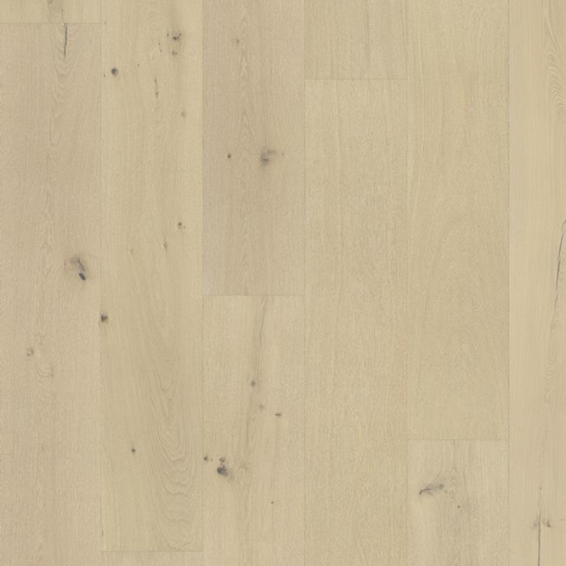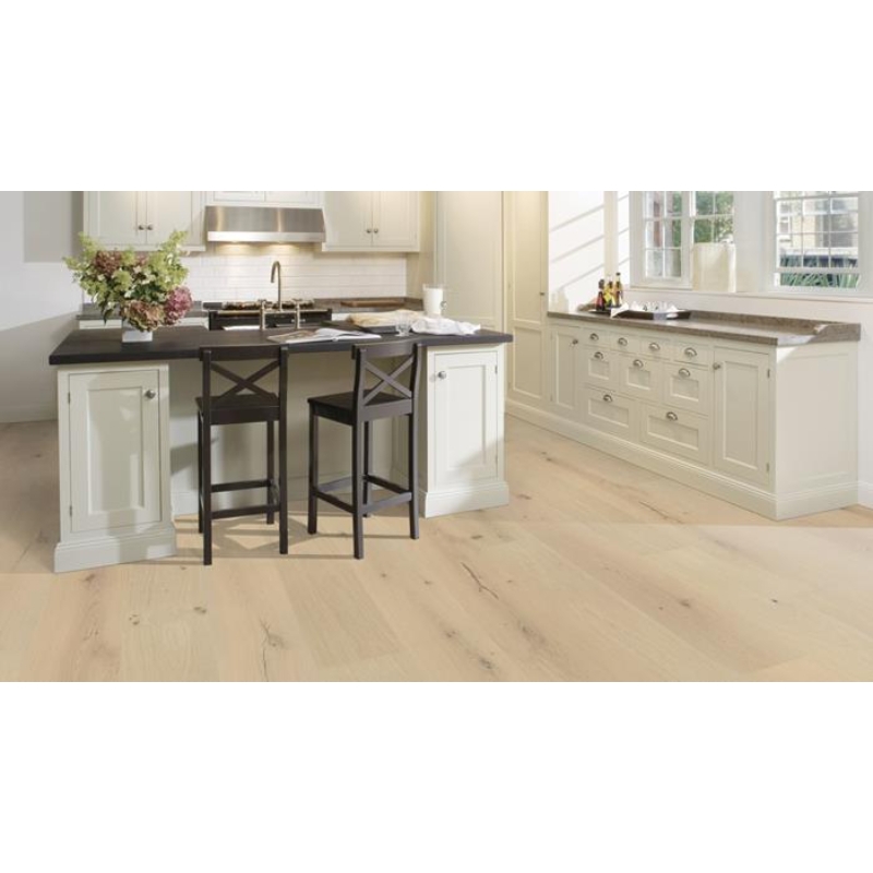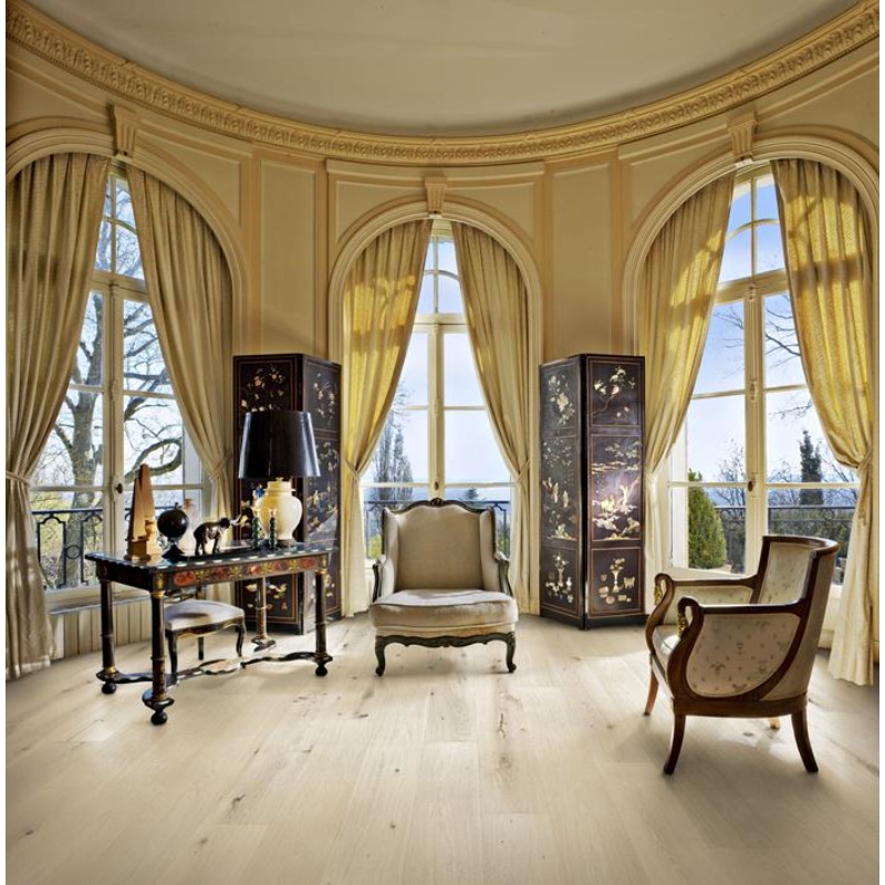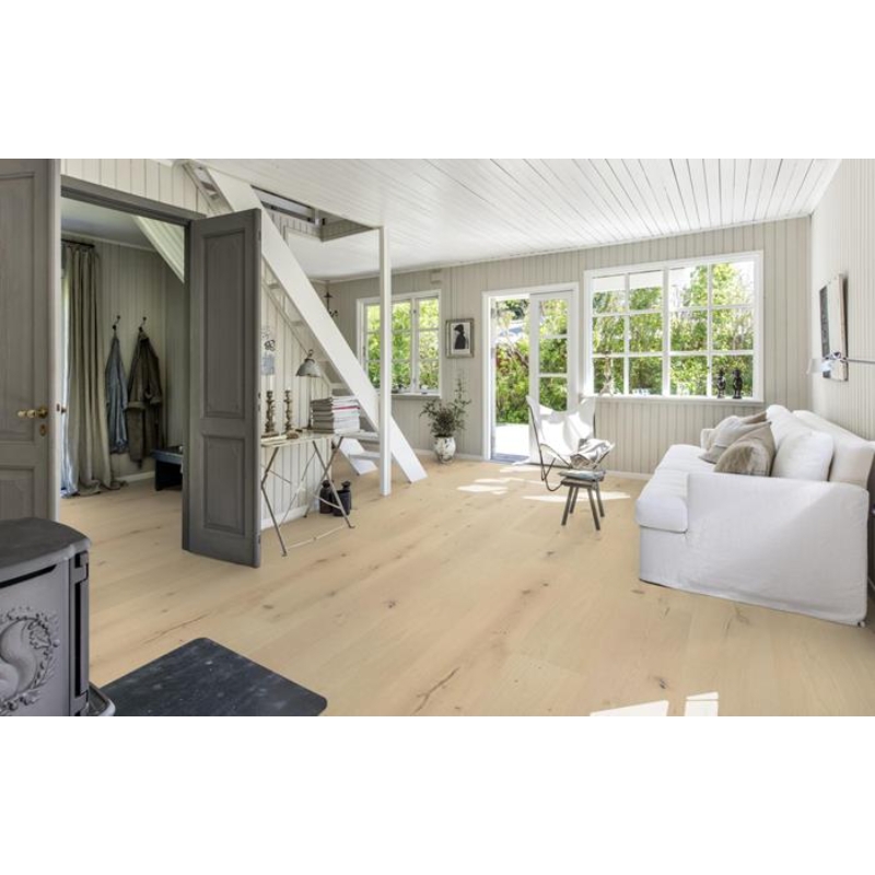 This classic single-strip oak floor from the Royal Collection features a misty white transparent stain, which enhances the organic design and allows distinctive gradations in the wood to come through. Four-sided micro-bevelling at the edges ensures a full plank look and feel. Each board is carefully brushed to bring out the character of the grain and highlight the natural texture of the wood.