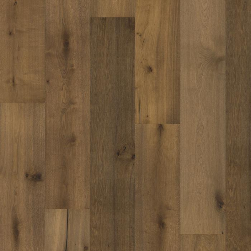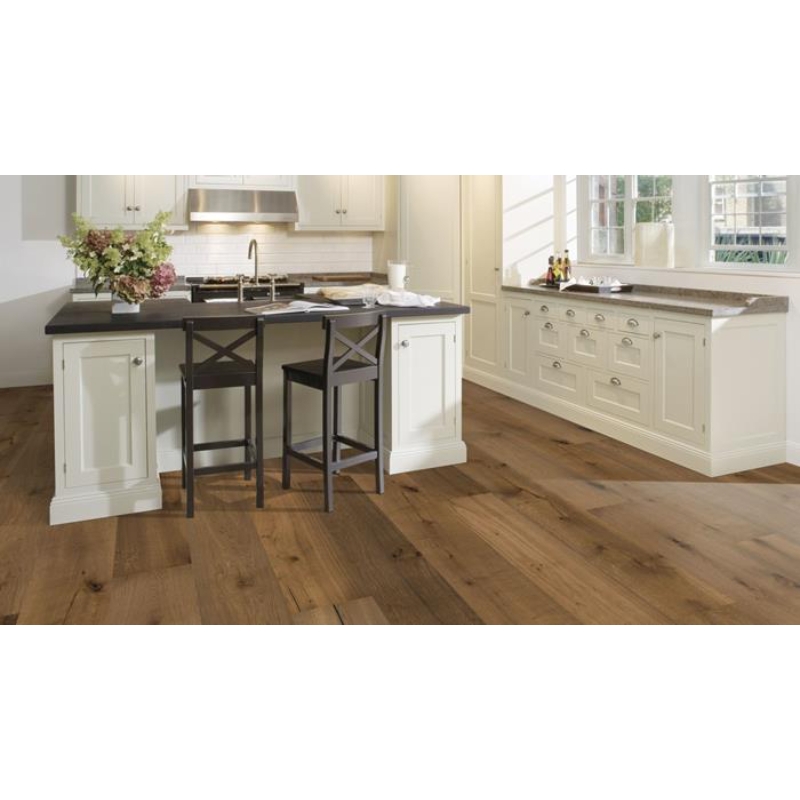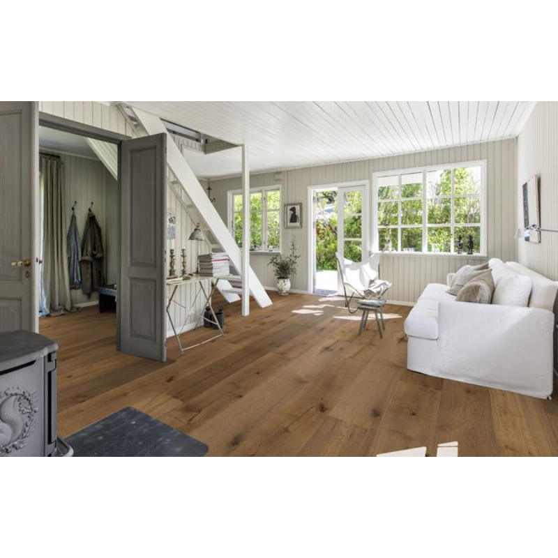 The smoked stone hues on this single-strip oak floor from the Royal Collection, enhance the earth undertones and balance the natural contrasts in the wood. Each board is carefully brushed to bring out the character of the grain and highlight the natural texture of the wood. Four-sided bevelling at the edges ensures a classic, full plank look and feel.
