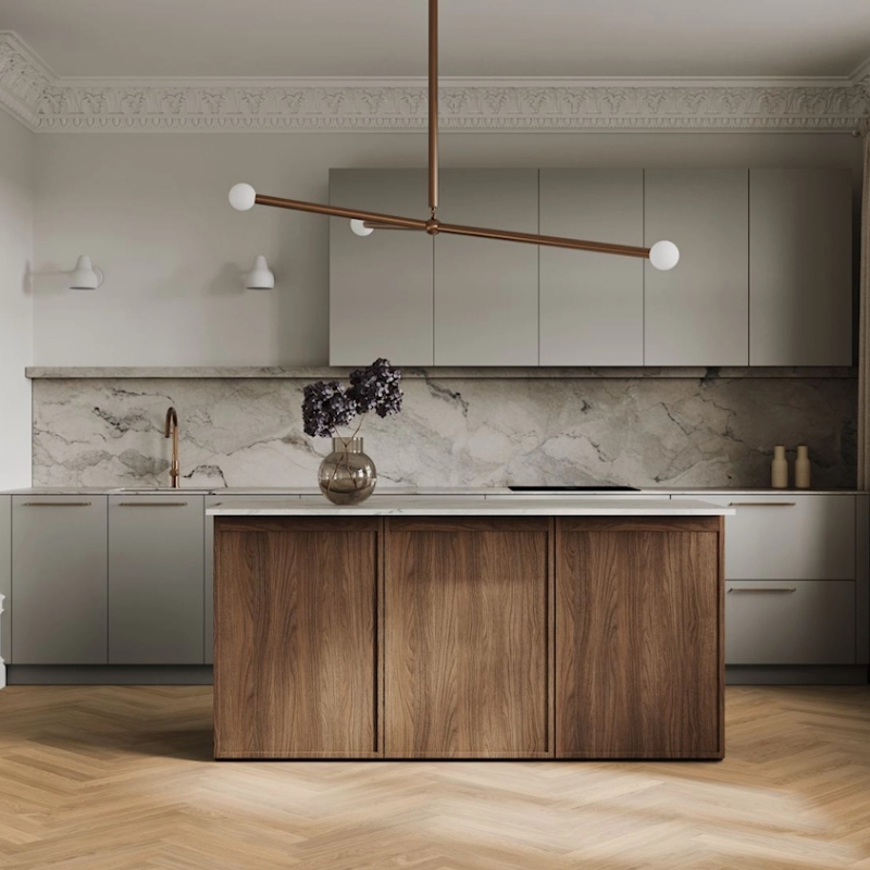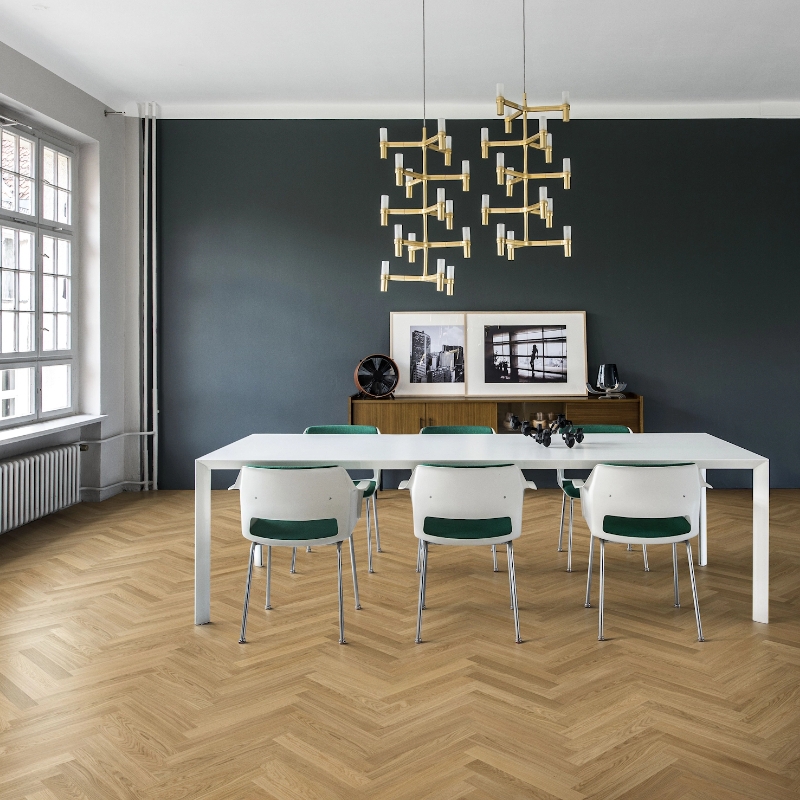 Clean 2-layer oak floor with subtle color variation and small knots, finished in matt for a natural look. Supplied with left and right elements for herringbone installation.