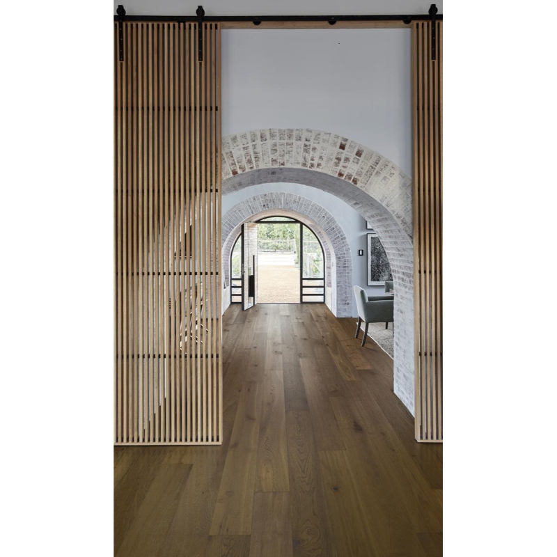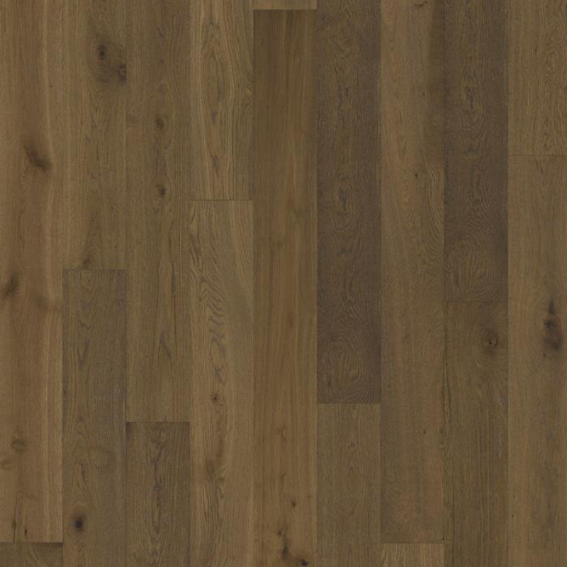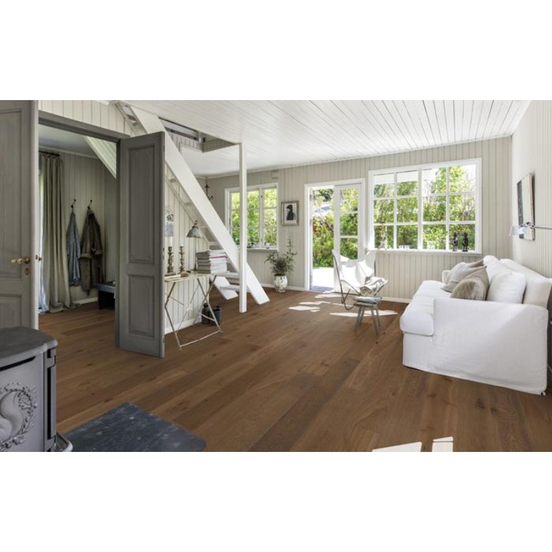 OAK JOY flooring from the Zen Collection is a versatile and elegant choice for any interior space. Its earthy brown color complements the chocolate undertones of the wood, and the single-strip design showcases the oak's natural grain pattern, enhanced by brushing and beveling. The matt lacquer finish adds a subtle sheen while protecting against wear.