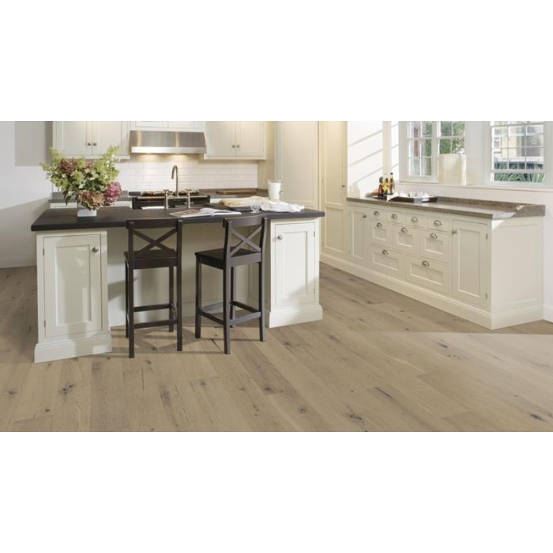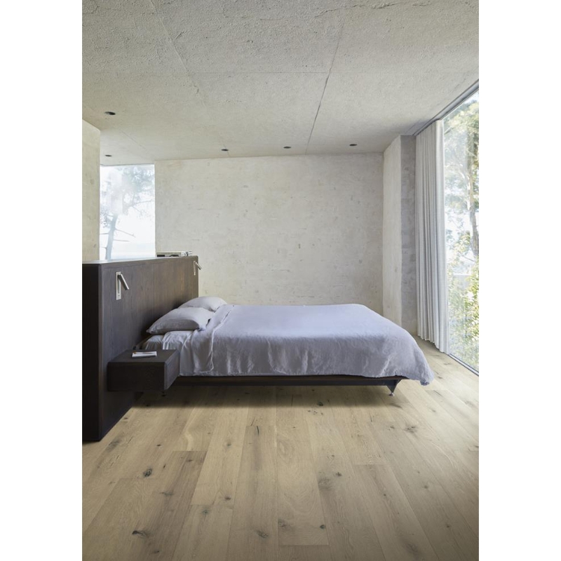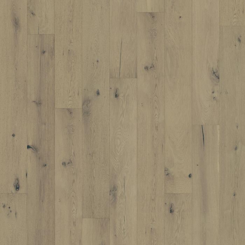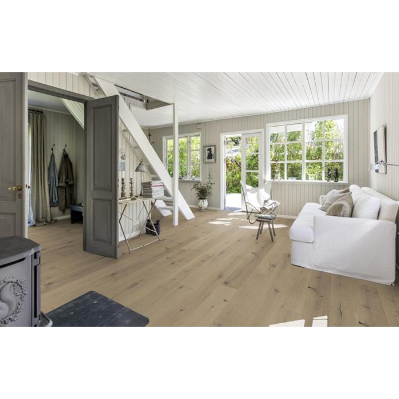 OAK CALM flooring has a serene semi-transparent stain that blends with the light oak tones, highlighting the natural knots and cracks. The brushed and beveled boards enhance the wood's texture, while the matt lacquer finish provides protection and a natural look. It's a timeless and elegant option that showcases the natural beauty of the wood.