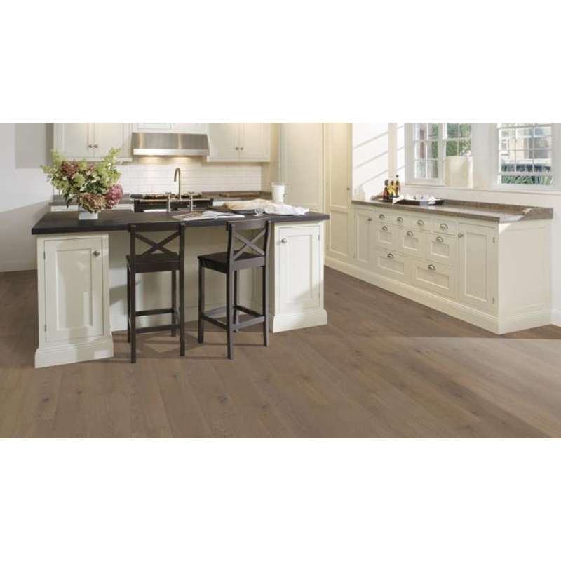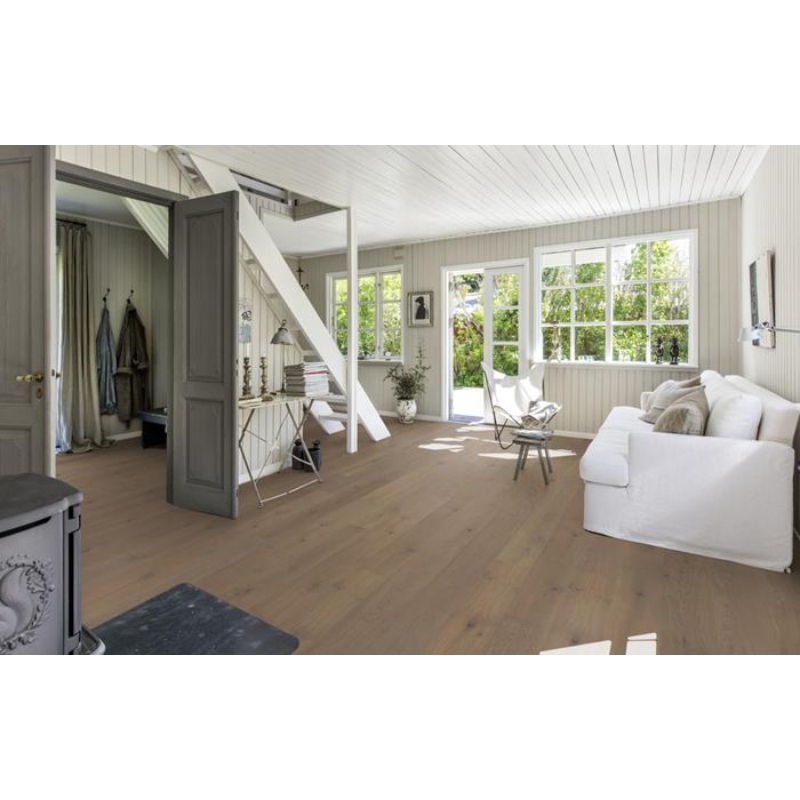 OAK HAPPINESS has a grey-stain and lightly smoked effect on the oak wood adding a unique and sophisticated look to any space. The knots and brushing process accentuates the natural grain of the wood, while the matt lacquer finish provides protection. A great choice of stylish and durable flooring.