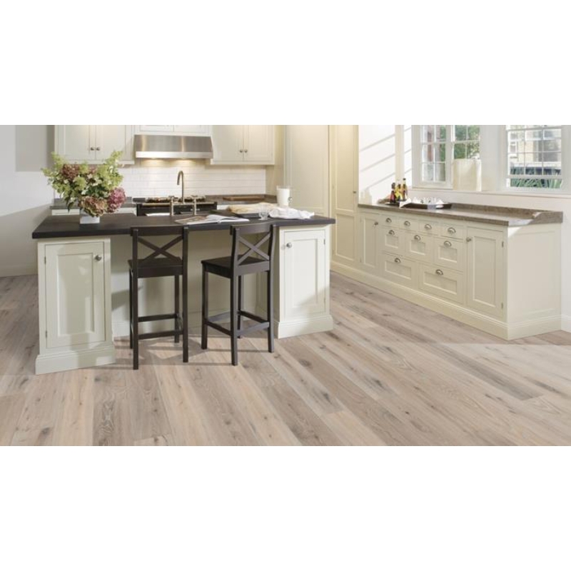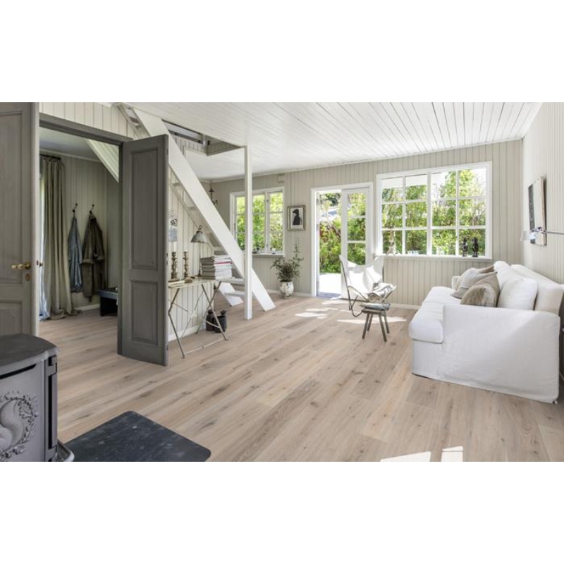 The blanched white finish on this single-strip oak floor from the Artisan Collection balances the naturally occurring colour variations, which range from heather grey to faded silver lavender, for a refined yet rustic effect. Each board is carefully brushed to bring out the character of the grain and highlight the natural texture of the wood. Four-sided bevelling at the edges ensures a classic, full plank look and feel. Hand-scraping enhances the worn appearance of the floor.