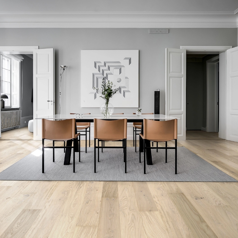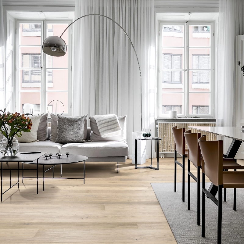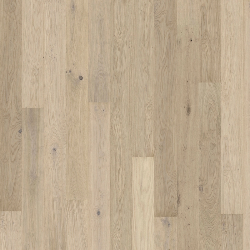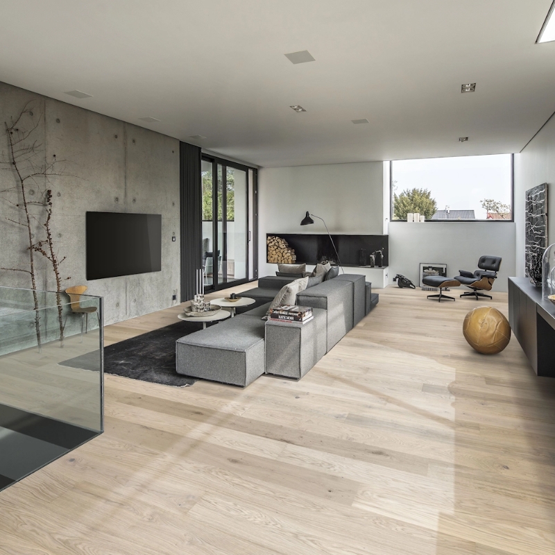 Misty white oak plank with distinctive wood gradations. Features brushed grain, four-sided micro-beveling, and ultra-matt lacquer finish. Provides newly sawn timber look with glare-free protection against daily wear.