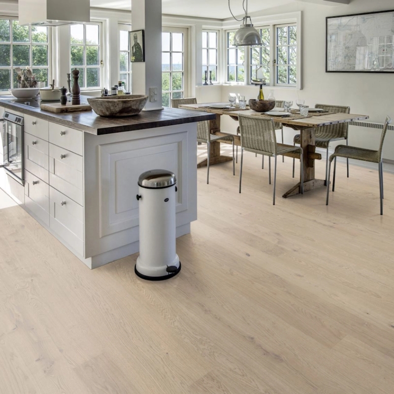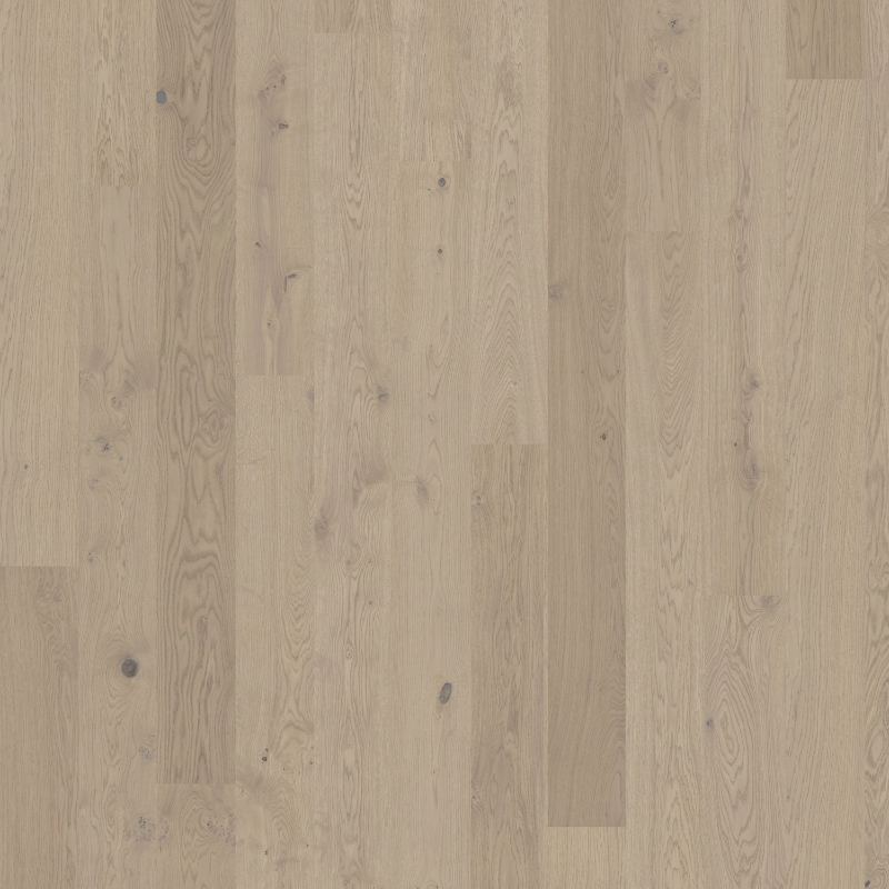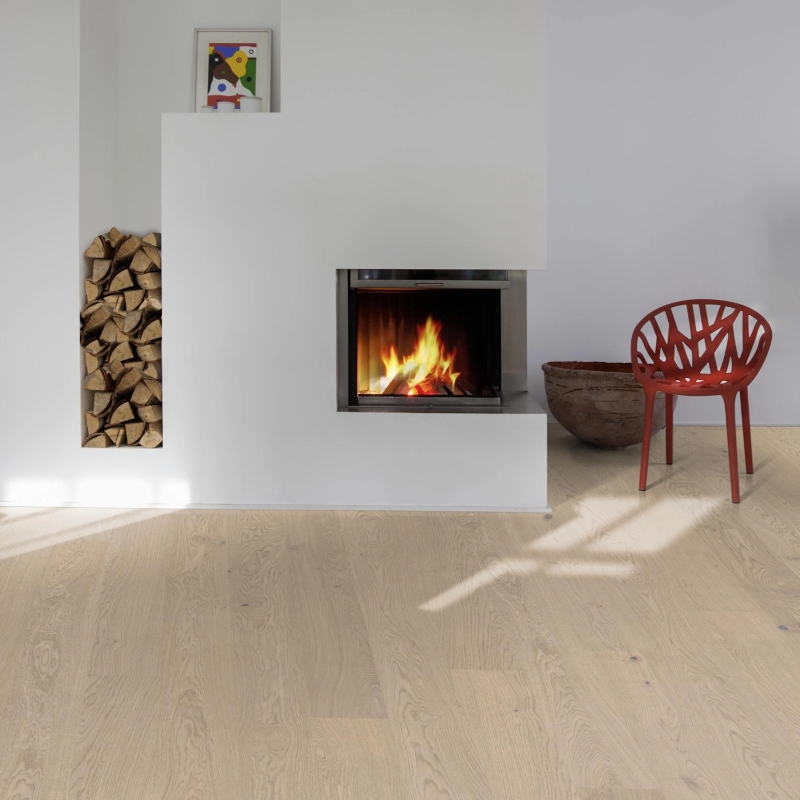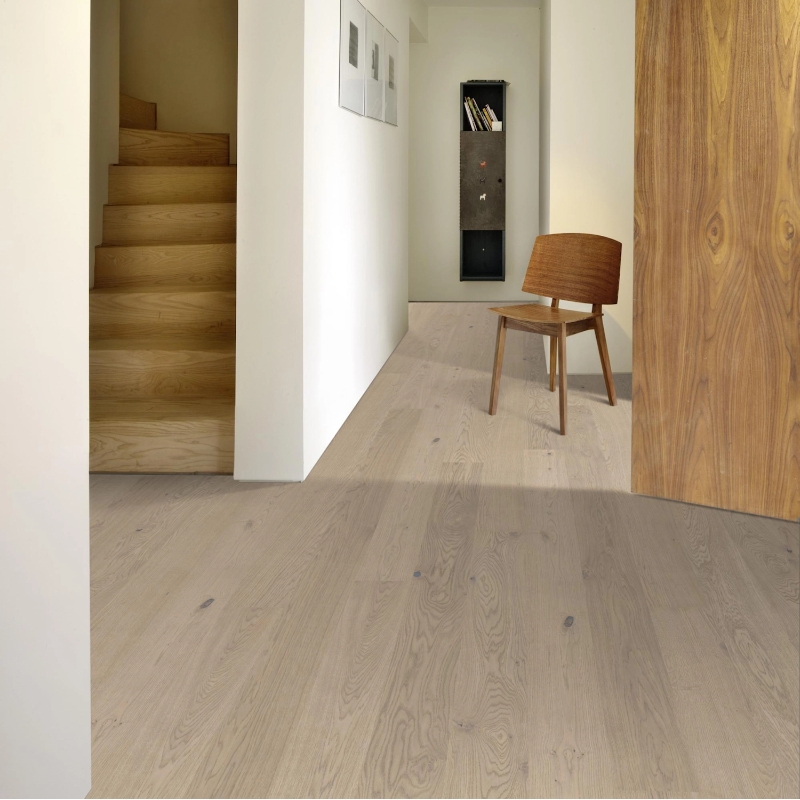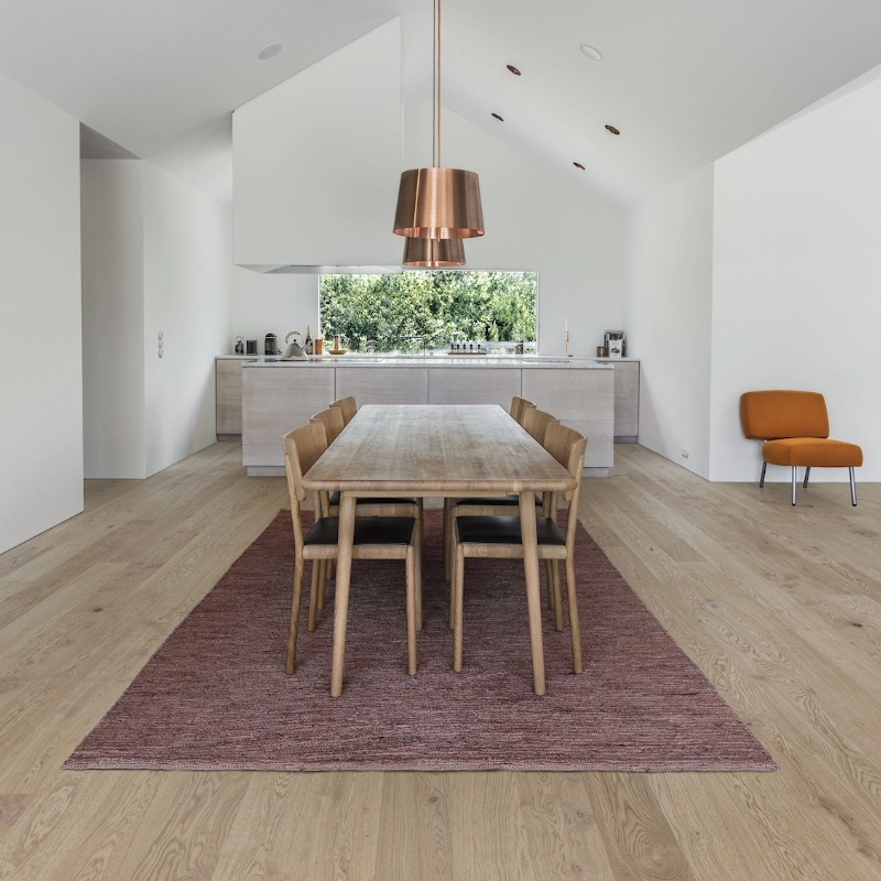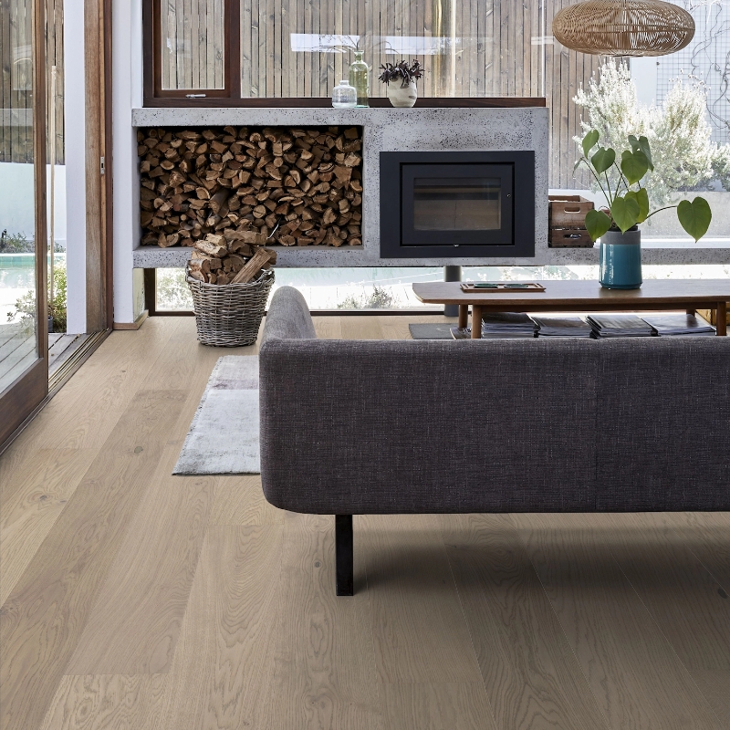 Plank oak floor with warm earth tones and stone grey hues. Brushed to enhance grain character, with ultra-matt lacquer for a freshly sawn look and micro-bevels for a classic full plank finish.