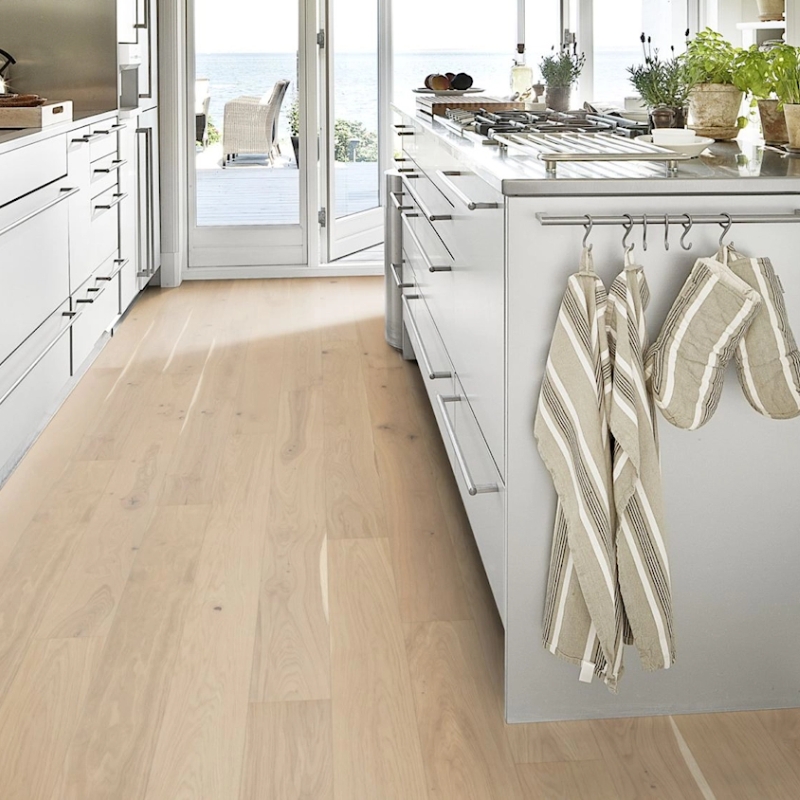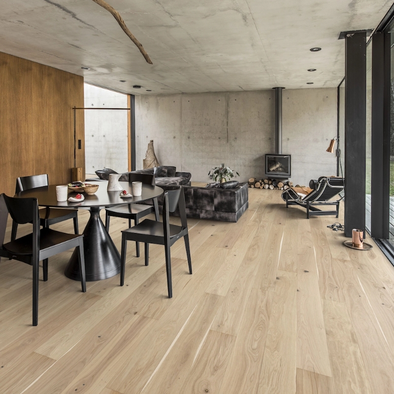 Plank oak floor with a misty white transparent stain that reveals distinctive wood gradations. Brushed to enhance grain character, with ultra-matt lacquer for a freshly sawn look and four-sided micro-bevels for a classic full plank appearance.