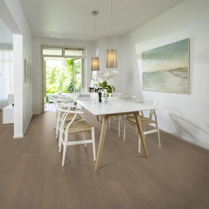 Earl grey oak with a tea-stained tone. Refined, modern feel with low variation and a smooth matte surface.