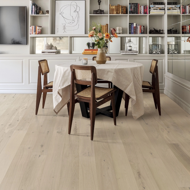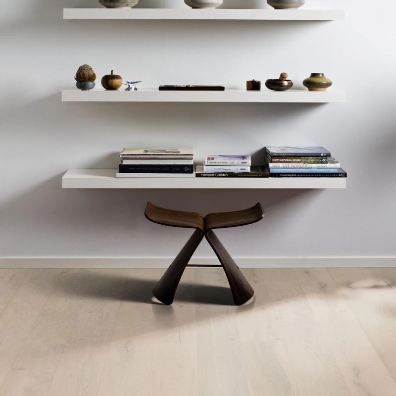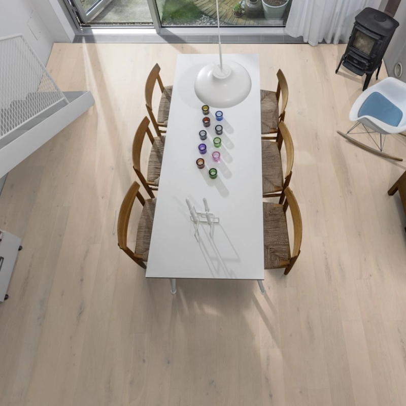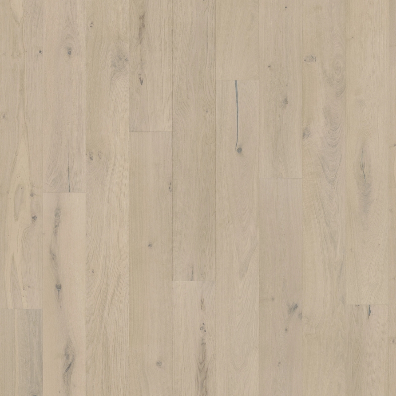 Plank floor inspired by smooth vanilla ice cream with grey highlights. Softly applied stain reveals natural wood with knots and cracks, finished with an ultramatt surface.