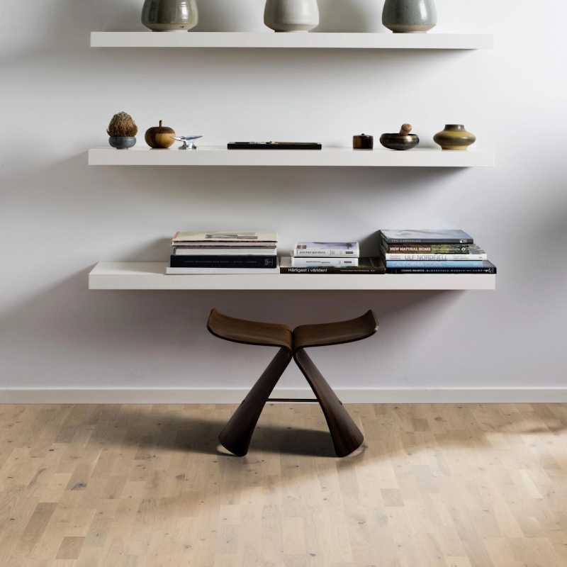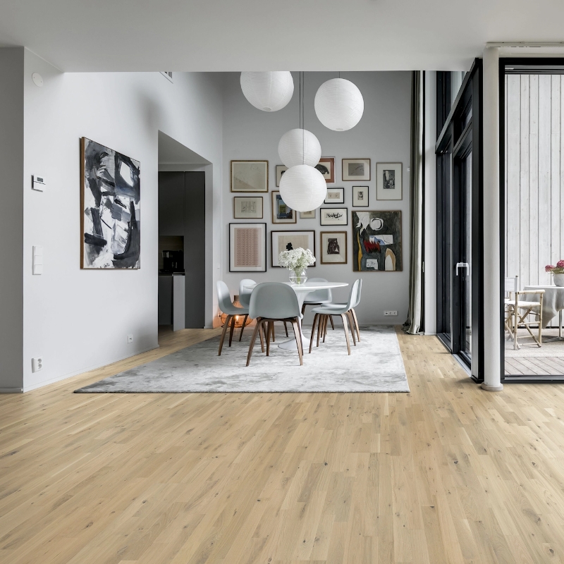 Plank floor inspired by late autumn grain fields covered in frost. Soft white and transparent stain reveals rustic wood, enhancing the natural design, finished with an ultramatt surface.