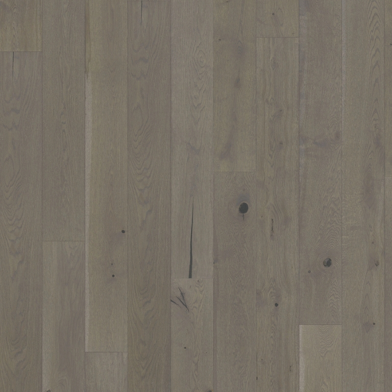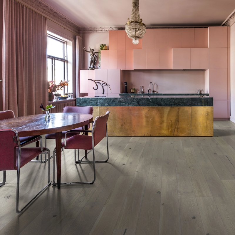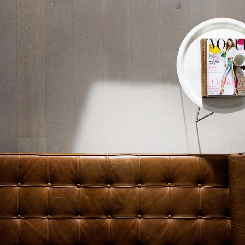 Plank floor in pearl grey, inspired by dark river stones in stormy water. The stain highlights rustic wood grain, finished with an ultramatt surface for a dramatic effect.