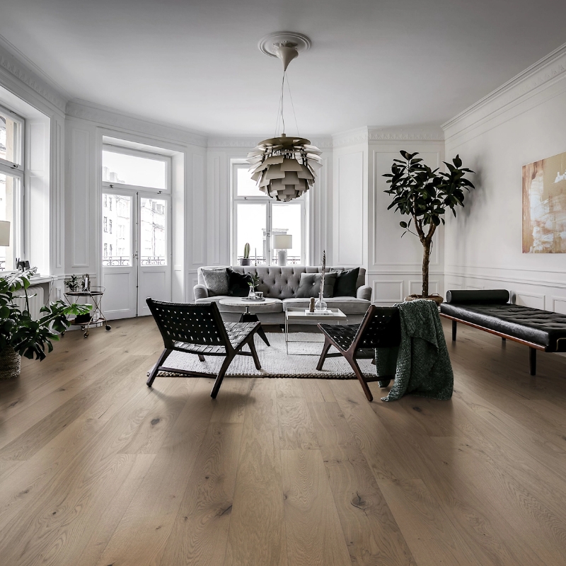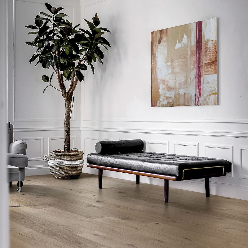 Plank floor inspired by a soft cashmere scarf in rosé yarn. Subtle stain highlights the rustic character of the wood, finished with an ultramatt surface.