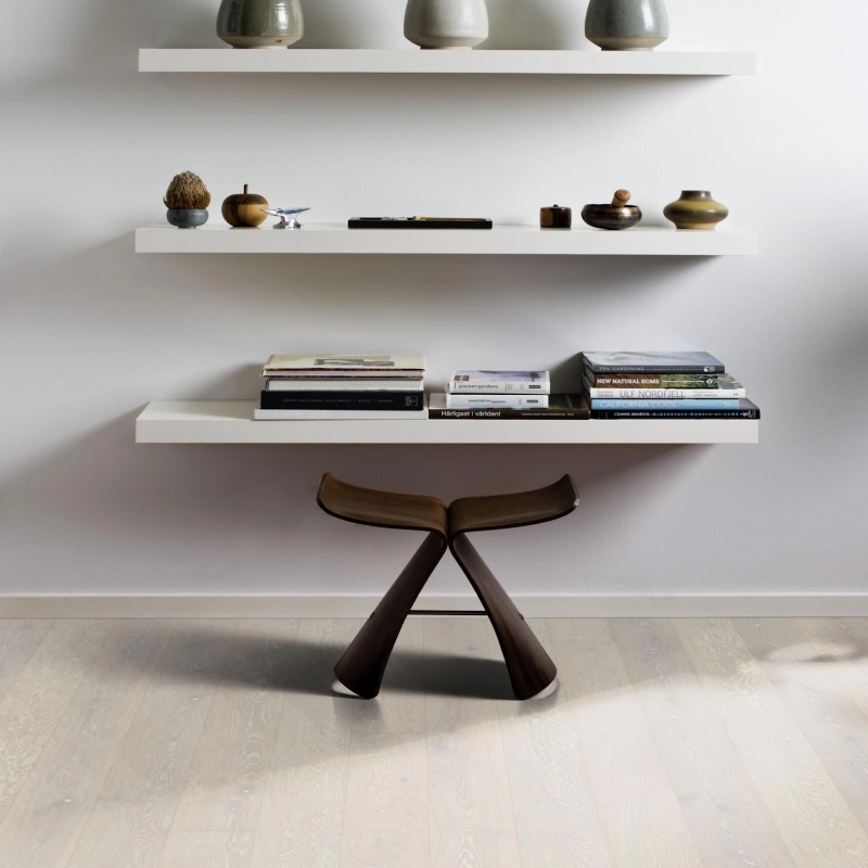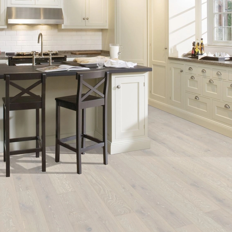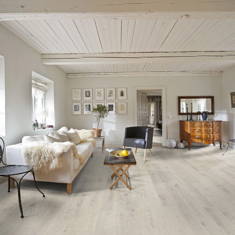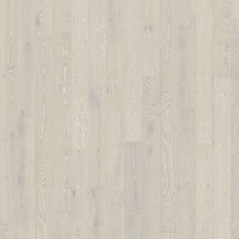 Powder white oak planks with brushed texture and natural color variation. The finish highlights grain detail and bevels with subtle luster, while a matt lacquer adds soft sheen and everyday protection. Four-sided bevelling completes the classic look.