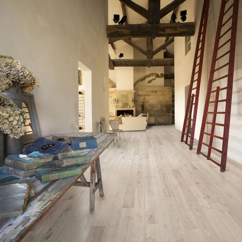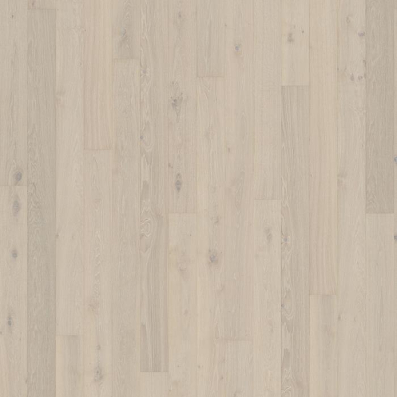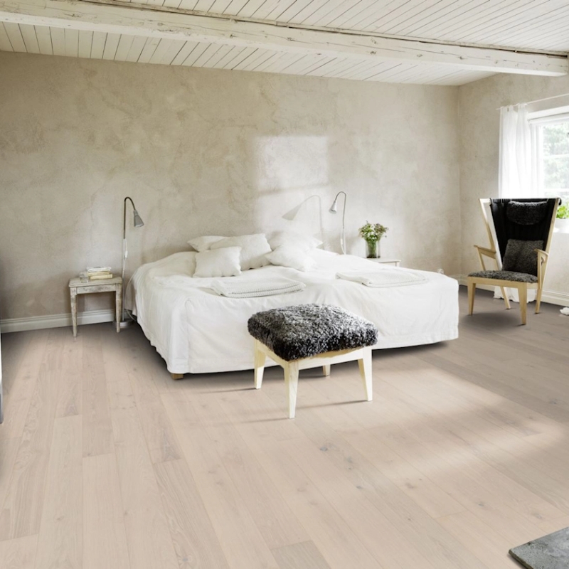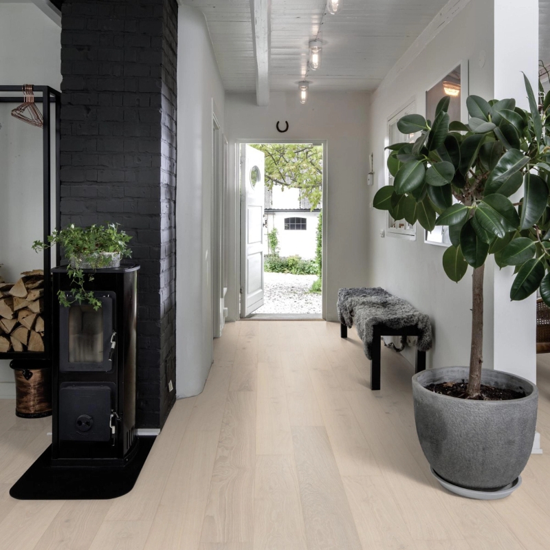 White oak floor with a semi-transparent stain that reveals warm hues for a balanced, Nordic look. Brushed to enhance grain texture, with four-sided micro-bevels for a classic full plank appearance. Matt lacquer provides glare-free protection.