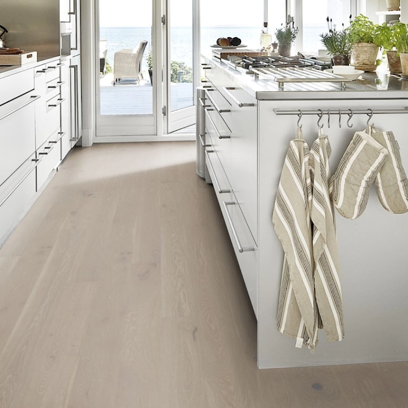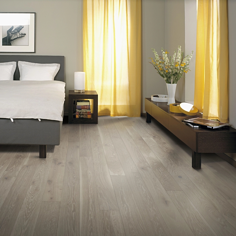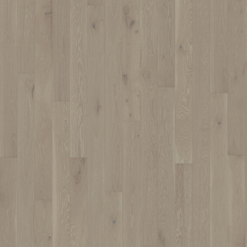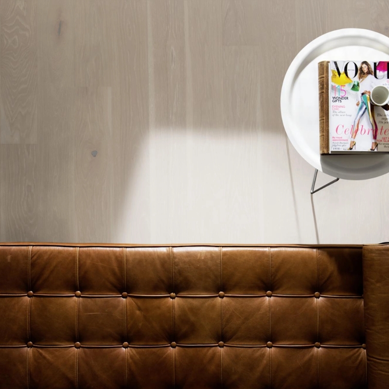 Oak floor with ash grey hues that enhance earth undertones and balance natural contrasts. Brushed to highlight grain and texture, with four-sided micro-bevels for a classic full plank look. Matt lacquer provides glare-free protection against daily wear.
