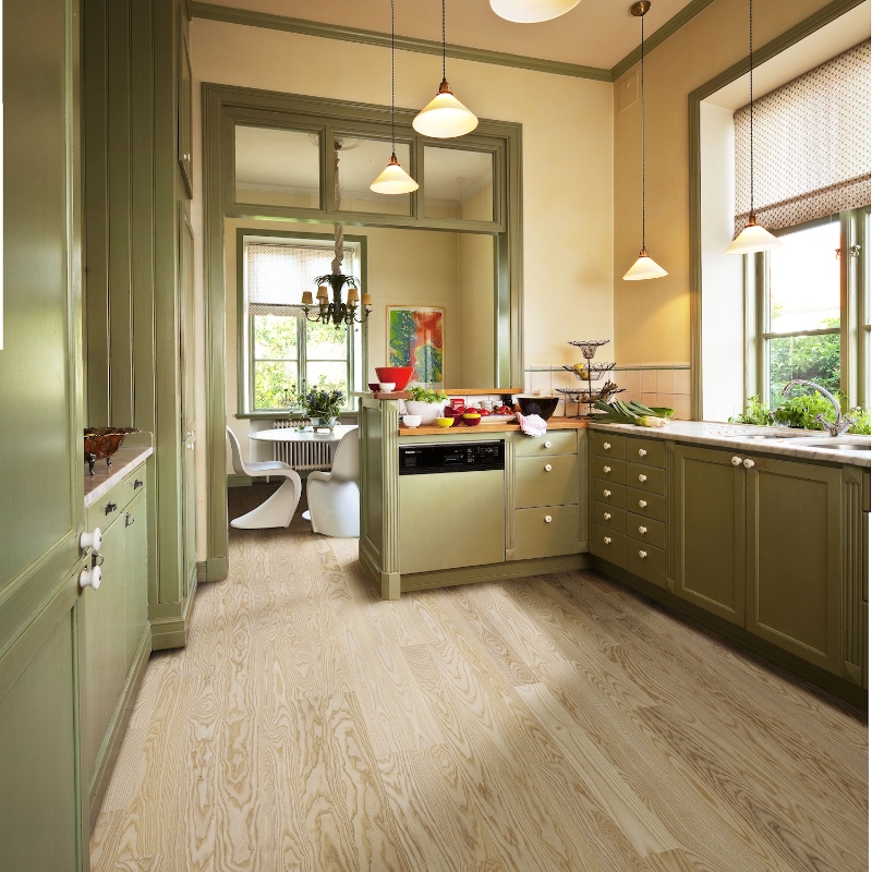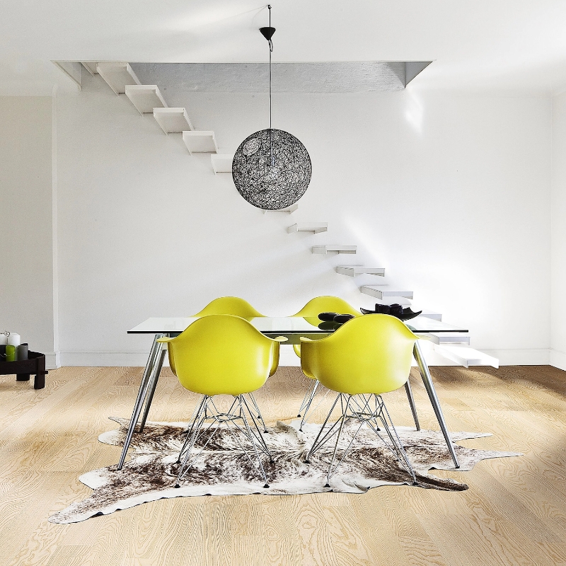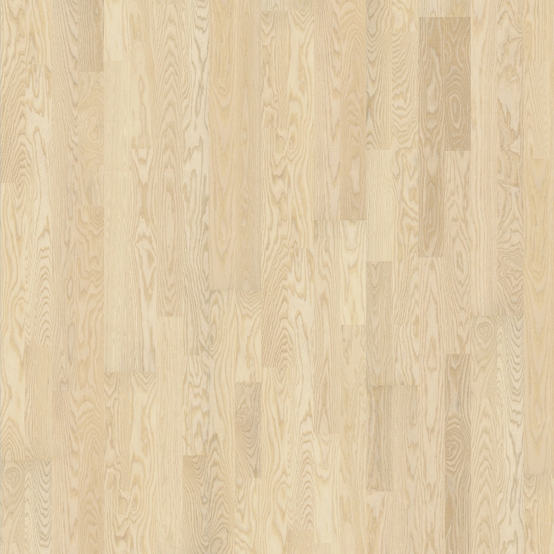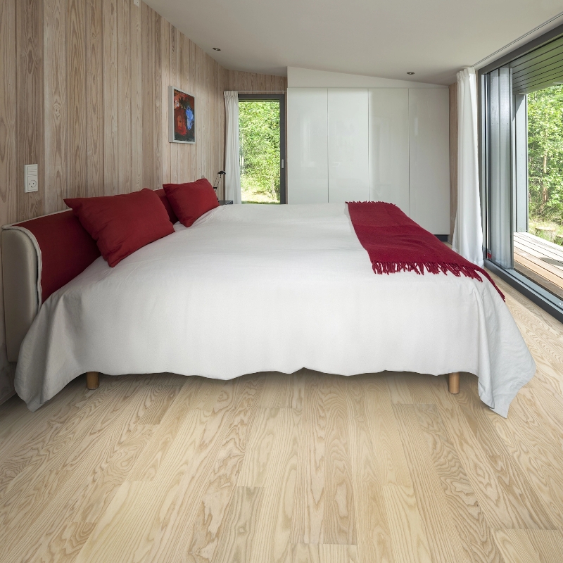 2-strip ash floor with a clean white finish that enhances the natural grain. Matt lacquer adds glare-free protection and durability.