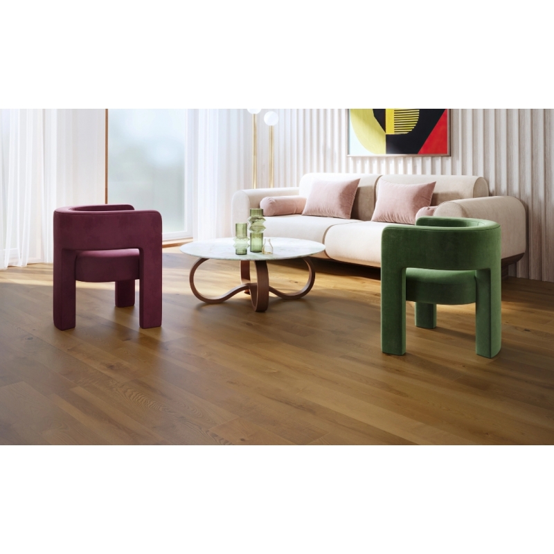 A stain application that softens the contrasts of the wood grain for a cozy, inviting look.