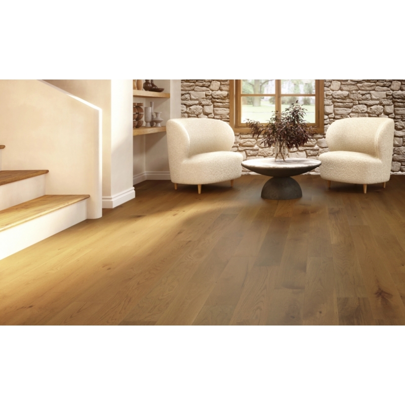 A stain application that softens the contrasts of the wood grain for a cozy, inviting look.