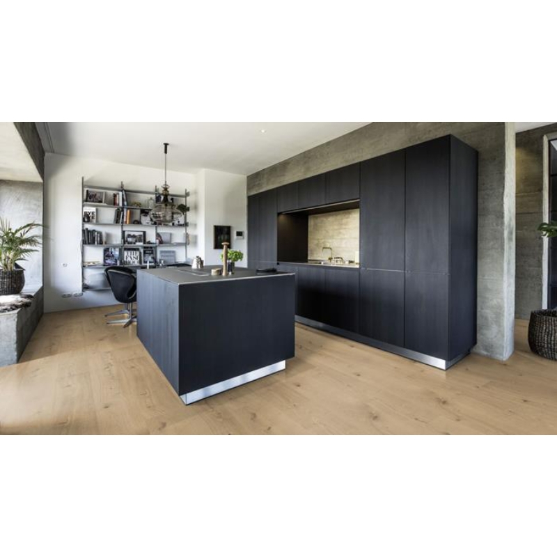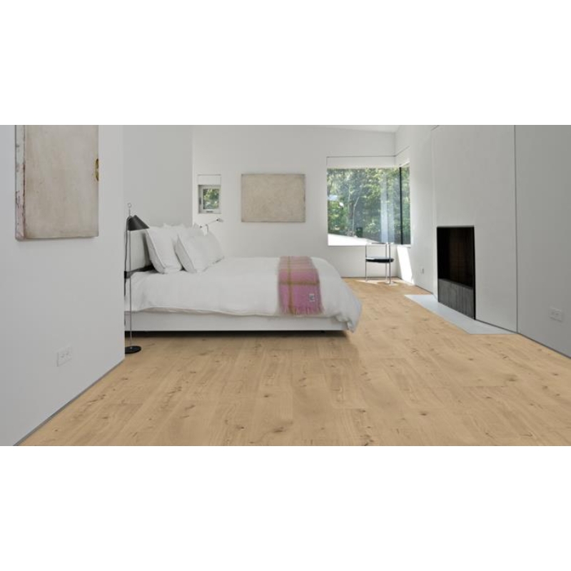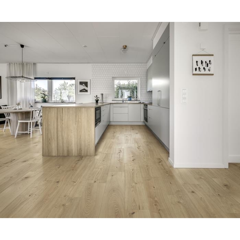 Kährs Luxury Tiles Click floor Coconino has a light natural oak design, softened by a transparent white stain, resulting in a timeless floor that complements any interior. The natural oak colour, wood grain and visible knots and cracks create an authentic look, enhanced by synchrone embossing.