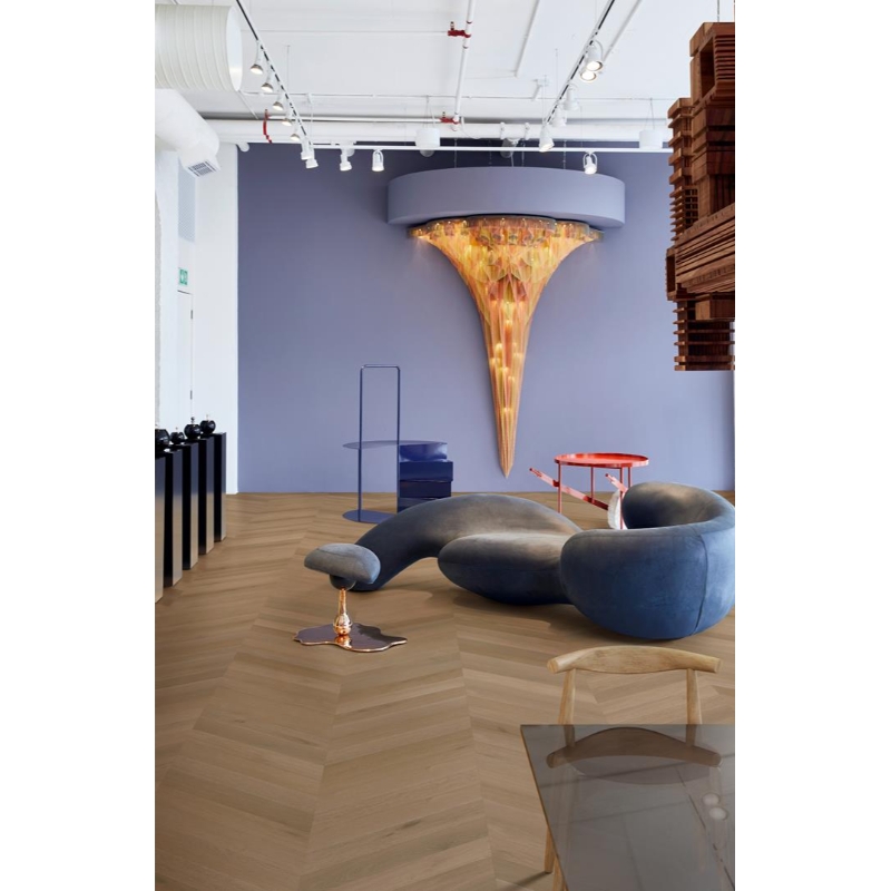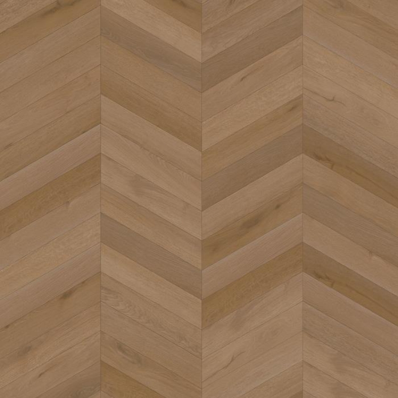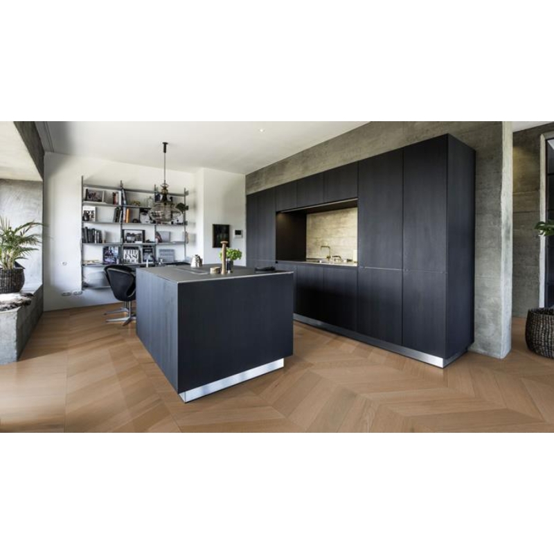 Dare to manifest your tenacity with Intention Chevron, where each step forward is a declaration of purpose, a commitment to tread lightly upon the Earth. Warm, darker tones in contrast with honey-coloured oak characterizes the colour of Intention. Natural features such as knots and cracks emphasize the authentic, slightly rustic look of this floor which will contribute to creating a homely and relaxed interior.