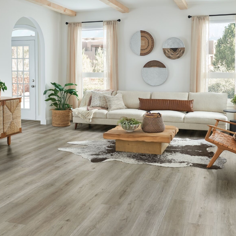Everguard is the answer if you love solid hardwood flooring but don’t want to risk water damage. Its rigid core construction handles cold, dry, or humid conditions without losing integrity. And it’s 100% waterproof. So, you don’t have to drop what you’re doing to wipe up spills frantically. Your floors won’t suffer an ounce of damage. Plus, rigid core flooring delivers a natural wood look. You can choose from traditional or distressed wood finishes in oak, pine, or white oak with 20 color options.